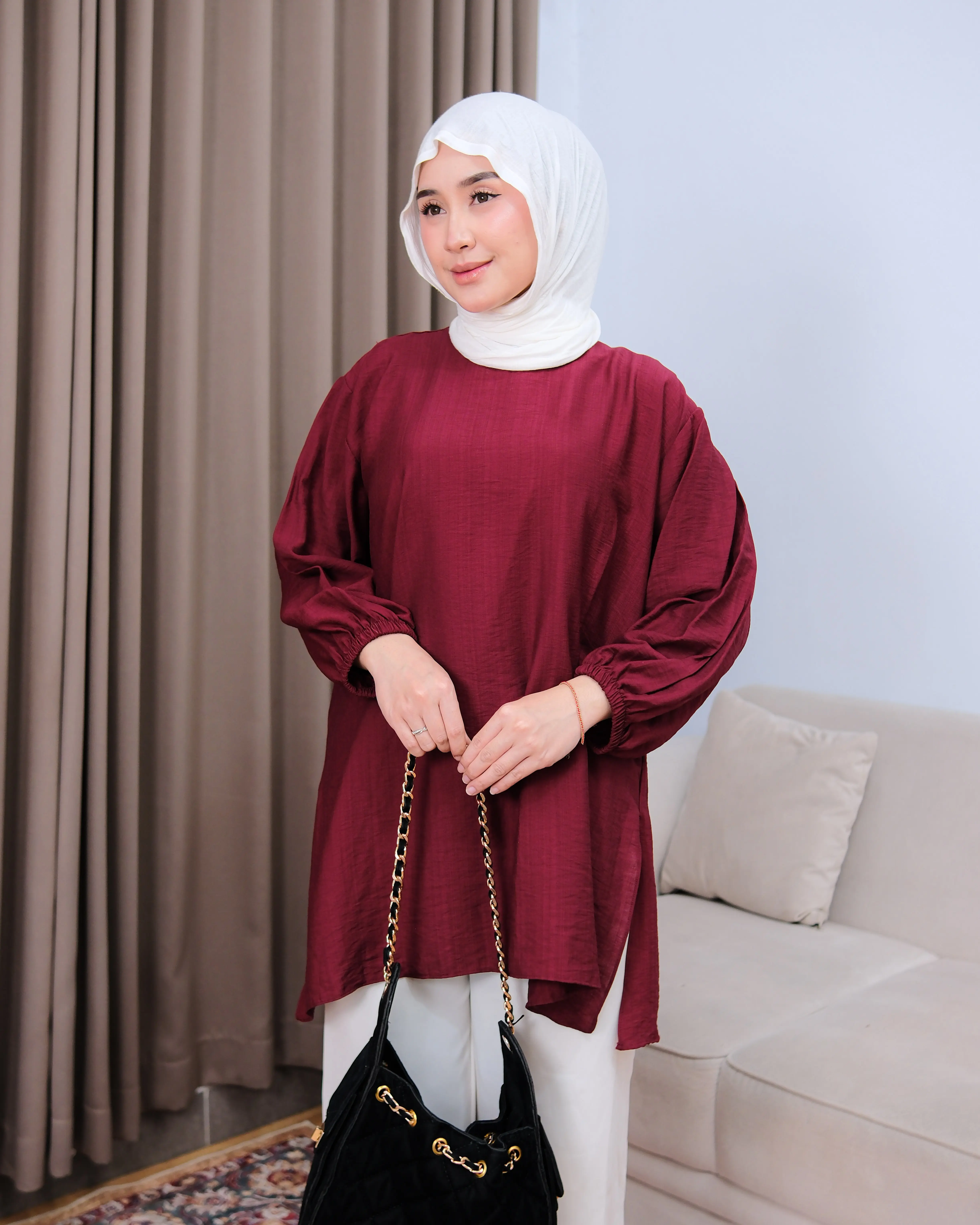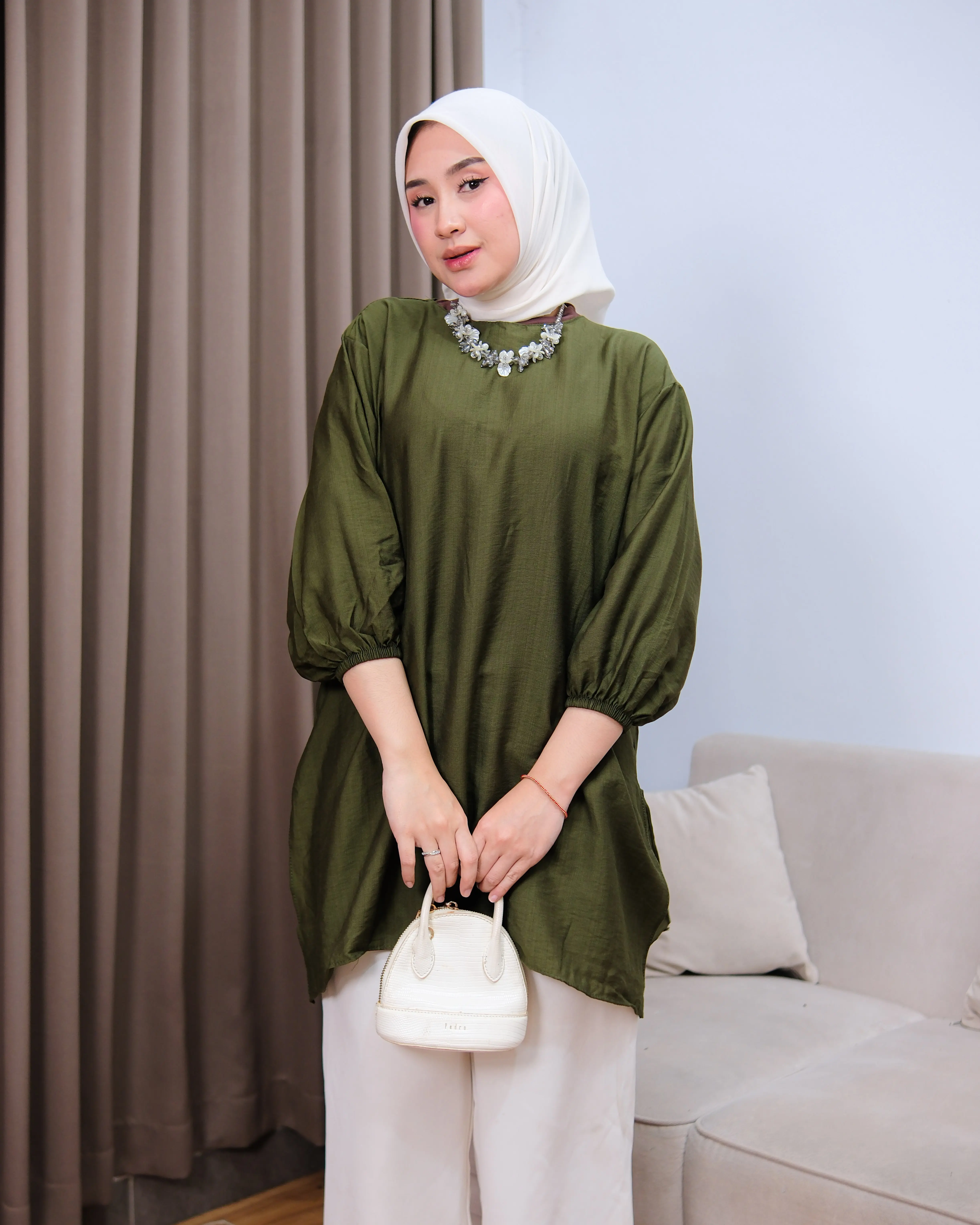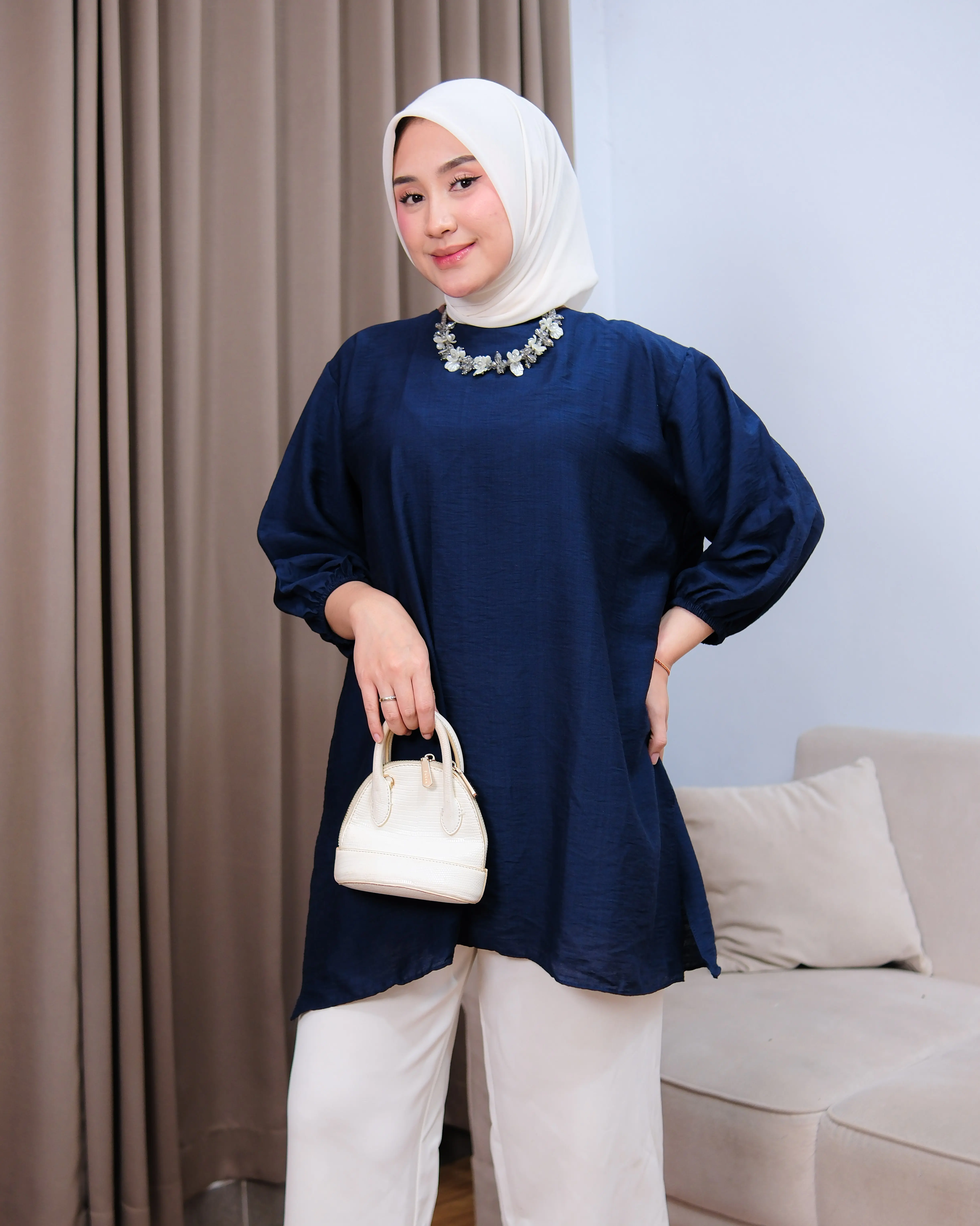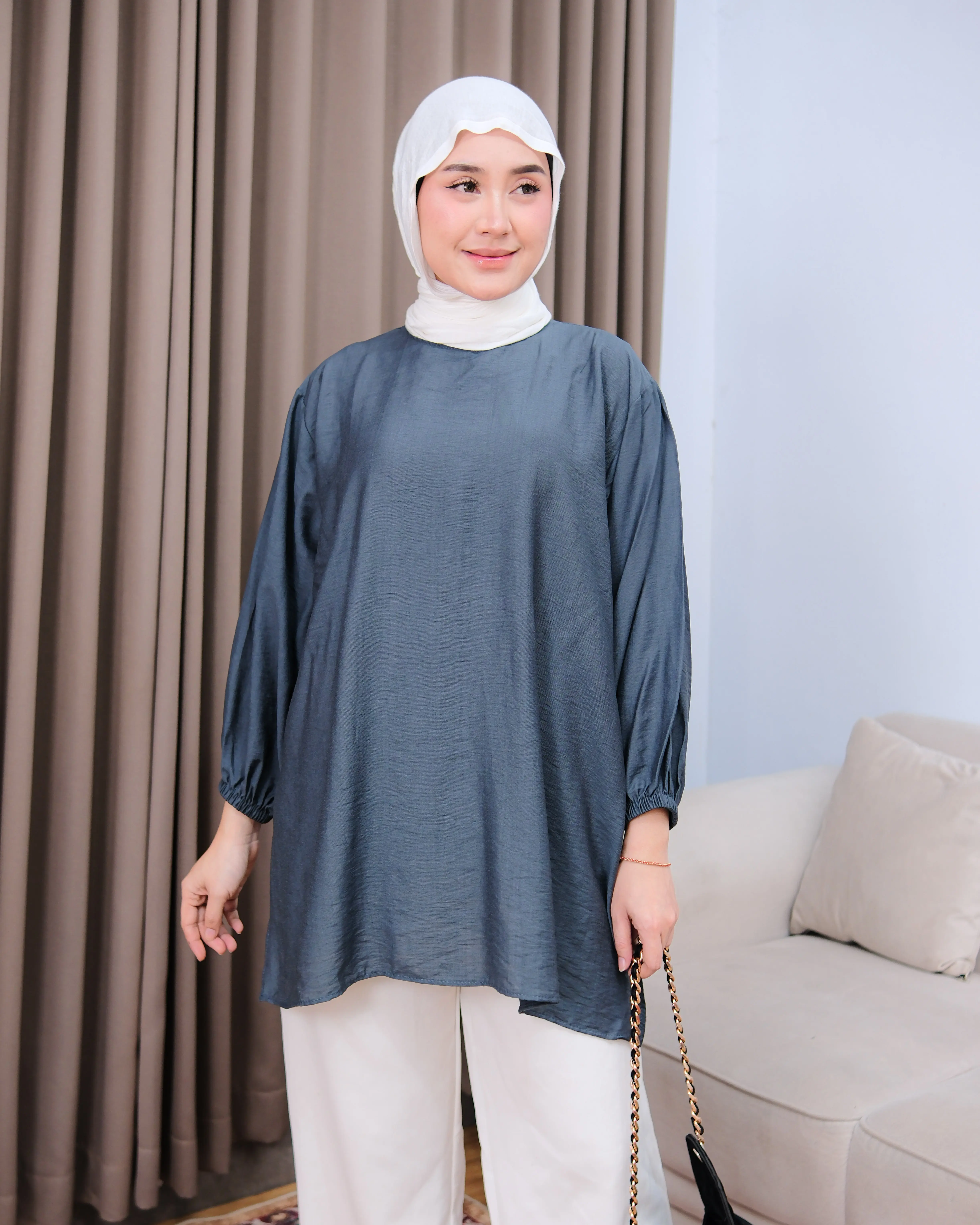 Tampil simpel tapi tetap stylish dengan tunik berbahan poli linen premium yang ringan, adem, dan tidak mudah kusut. Desain loose fit membuat nyaman dipakai seharian, cocok untuk aktivitas harian hingga acara semi-formal.