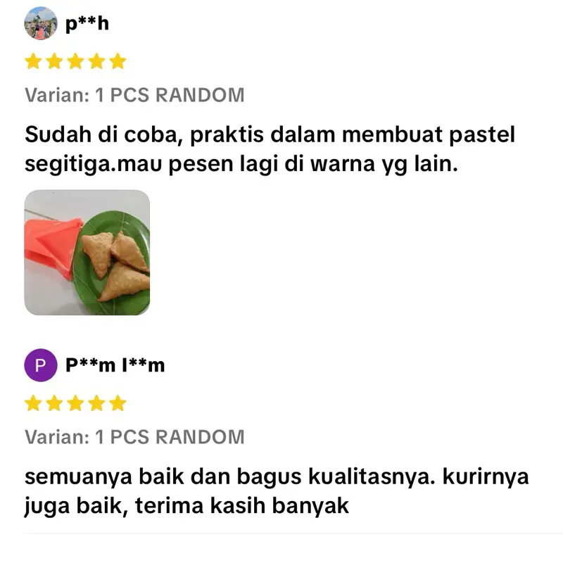 Sudah di coba, praktis dalam membuat pastel segitiga.mau pesen lagi di warna yg lain.
