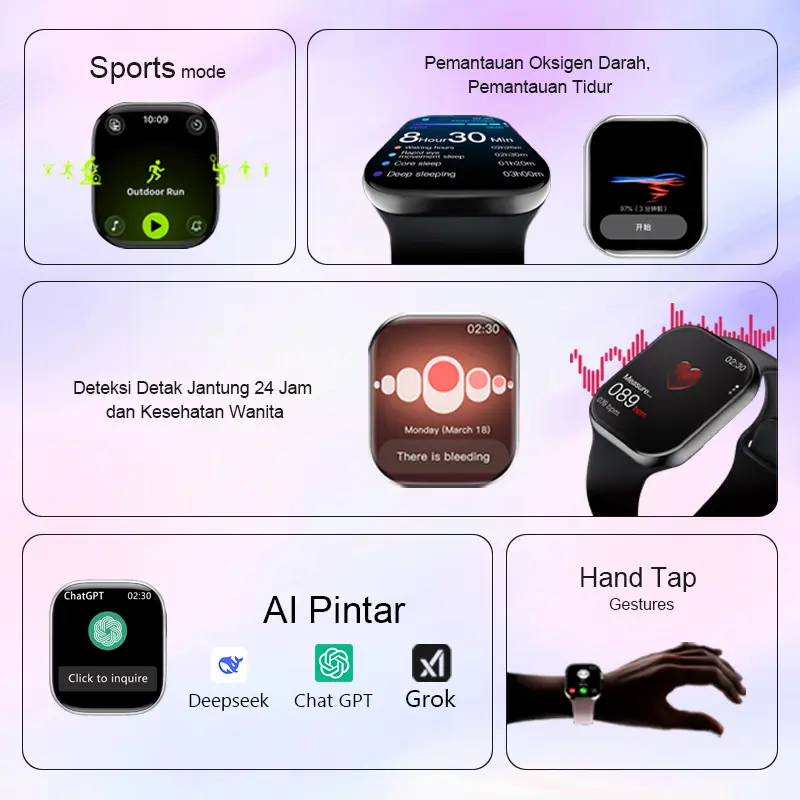Untuk lihat waktu, terima pesan sehari-hari sudah cukup. Pemantauan kesehatan juga akurat, data detak jantung, tidur jelas. Bisa ingatkan untuk duduk terlalu lama. Penampilannya bagus, cocok dengan pakaian olahraga atau sehari-hari. Nilainya tinggi, beli tidak rugi!