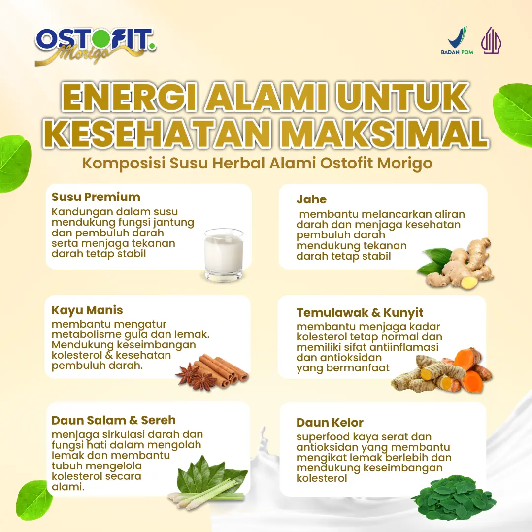 Ostofit Morigo hadir sebagai pilihan minuman herbal yang nyaman dikonsumsi setiap hari, dengan rasa yang enak Dengan sertifikasi BPOM & HALAL dan formulasi yang mendukung gaya hidup sehat.