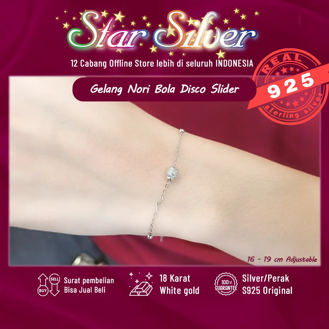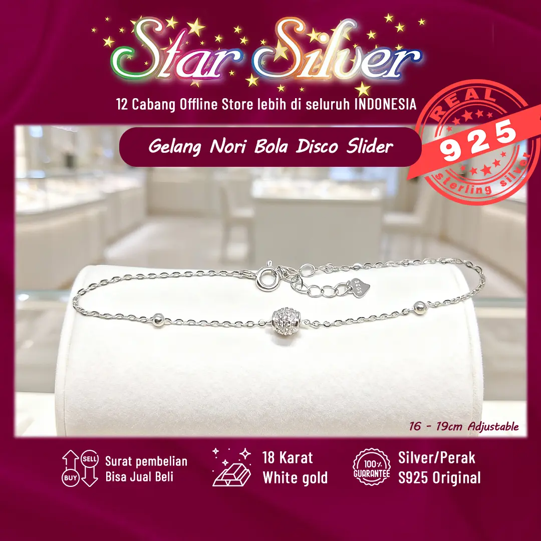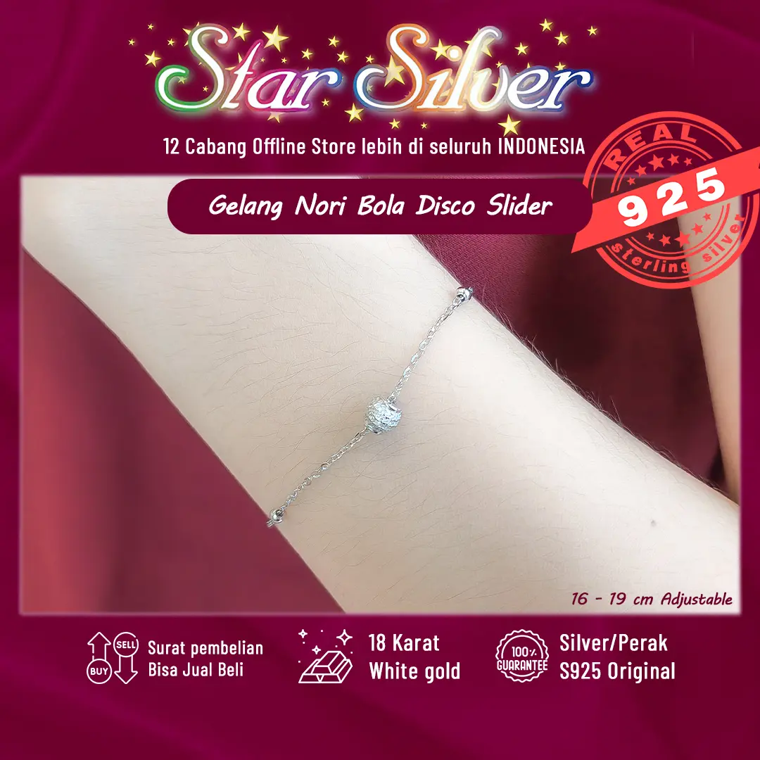 Gelang Tangan Nori Bola Disco Slider Star Silver Perak S9.25 Asli