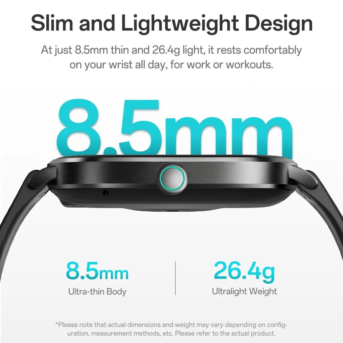Huafit A2 hadir dengan ketebalan hanya 8.5mm dan berat 26.4g, sangat nyaman dikenakan di pergelangan tangan sepanjang hari, baik saat bekerja maupun berolahraga.