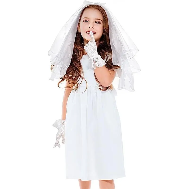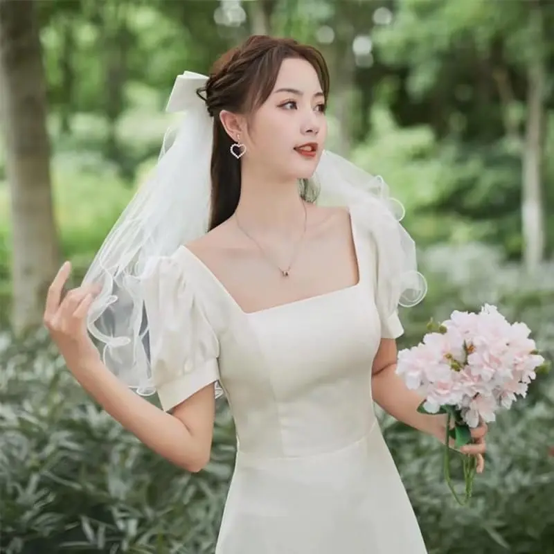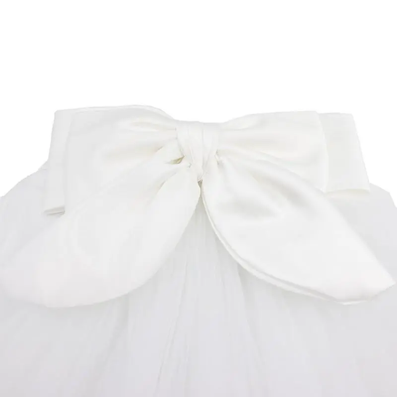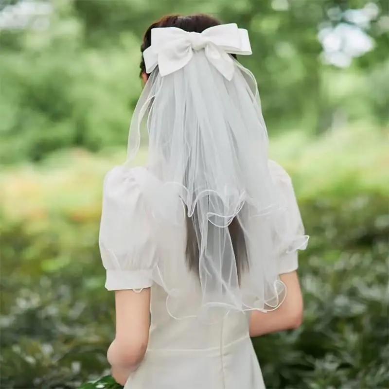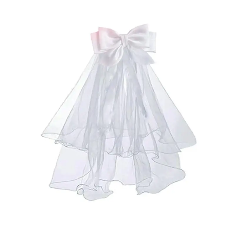 • Desain Elegan: Kerudung tulle berlapis ganda yang dihiasi dengan pita satin putih mewah berbentuk pita, memancarkan pesona romantis
