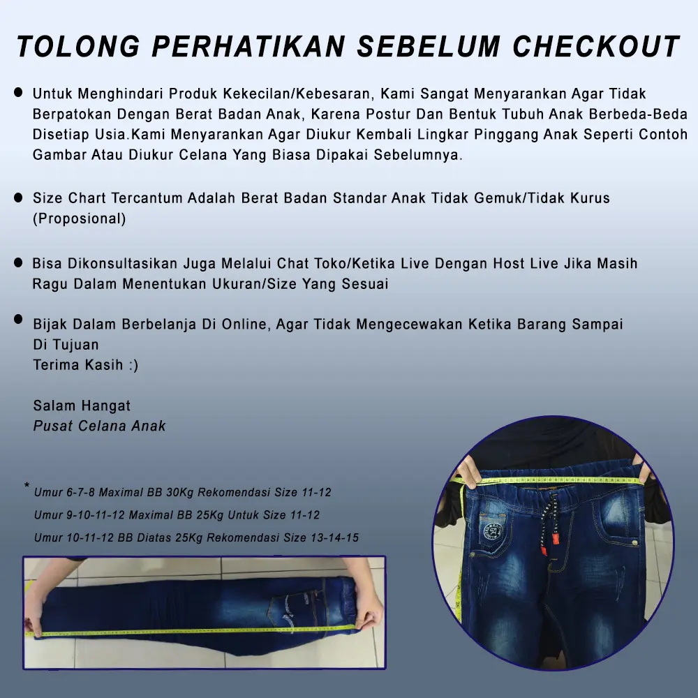 • Didesain khusus untuk anak berusia 1-15 tahun. Pastikan memilih ukuran yang tepat untuk kenyamanan anak Anda. Celana jeans ini menjadi pilihan ideal untuk kebutuhan fashion anak Anda.