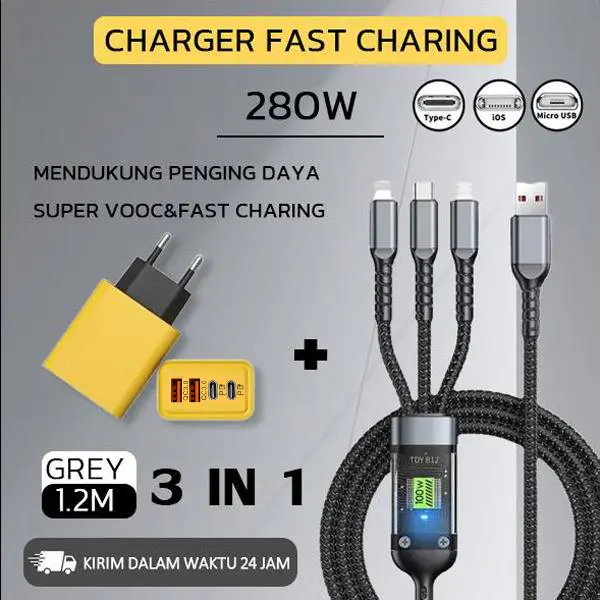 Charger 280W Batok + Kabel Data 3in1 Fast Charging 100W USB Micro, Type C, Lightning Best Quality