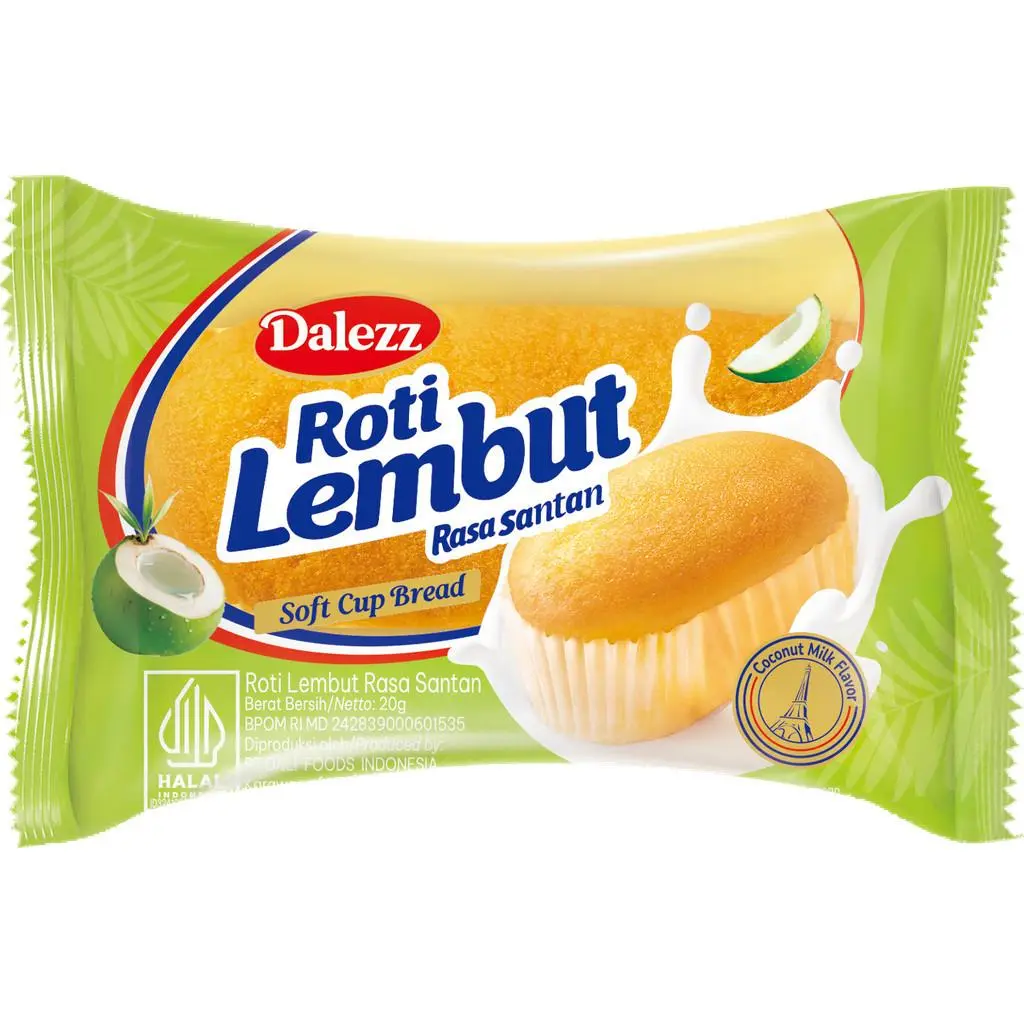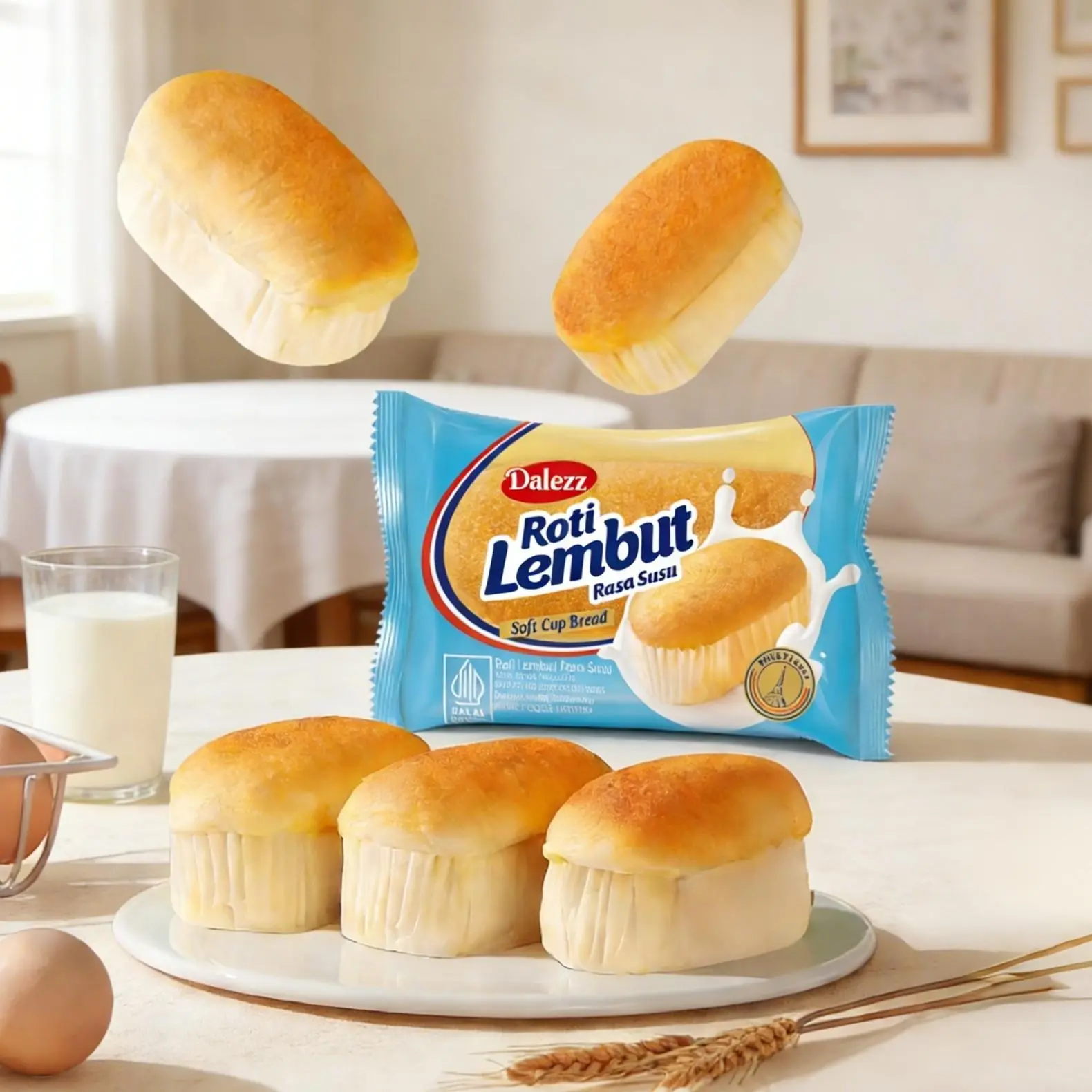 Roti Lembut Rasa Susu (Soft Cup Bread Milk Flavor): BPOM RI MD 242839000701535 Roti Lembut Rasa Santan (Soft Cup Bread Coconut Milk Flavor): BPOM RI MD 272839000101535 1. Lembut & Manis, 2 Rasa Istimewa:Roti dengan tekstur sangat lembut dan empuk. Menghadirkan dua pilihan rasa autentik: Susu klasik yang creamy dan Santan yang harum alami. 2. Kemasan Individu, Tetap Lembut & Praktis:Setiap roti dikemas per 20g secara individu, kedap udara dan anti lembab untuk menjaga kesegaran. Sangat higienis dan praktis untuk dibawa ke mana saja. 3. Pilihan Paket Fleksibel, Sesuai Kebutuhan:Tersedia dalam kemasan 10, 15, dan 20 pcs. Ukuran kecil cocok untuk dicoba, ukuran besar lebih hemat untuk stok keluarga atau acara. 4. Sempurna untuk Sarapan & Camilan:Siap santap, solusi sarapan cepat yang sempurna. Juga cocok jadi camilan saat lapar di siang atau sore hari. Lezat disajikan dengan susu atau teh. 5. Higienis, Mudah Dibagikan:Kemasan individu menjamin kebersihan, mencegah kontaminasi. Sangat mudah dan aman untuk diambil dan dibagikan kepada siapa saja. Perhatian: 1. Produk mengandung gandum dan susu. Penderita alergi terkait harap berhati-hati. 2. Jauhkan plastik kemasan dari jangkauan bayi dan balita untuk mencegah bahaya tersedak. 3. Jika kemasan individu rusak, menggelembung, atau bocor, jangan dikonsumsi. 4. Warna produk mungkin sedikit berbeda tergantung batch, kondisi nyata mengikuti produk fisik.