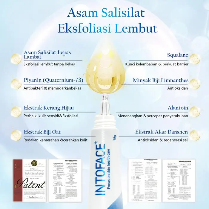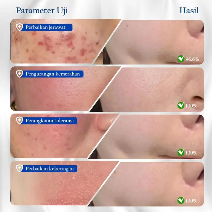 Bahan AktifFungsiAsam Salisilat (Salicylic Acid)Membersihkan pori-pori, mengurangi minyak berlebihEkstrak Centella AsiaticaMenenangkan kulit & mengurangi kemerahanNiacinamideMencerahkan kulit & mencegah bekas jerawatEkstrak Kerang Hijau (Green Mussel)Anti-inflamasi & mempercepat pemulihan kulitEkstrak Akar SalviaMengontrol pertumbuhan bakteri penyebab jerawatCeramideMemperbaiki dan menjaga skin barrierEkstrak Gandum (Avena Sativa)Menghidrasi dan mengurangi iritasi ringan
