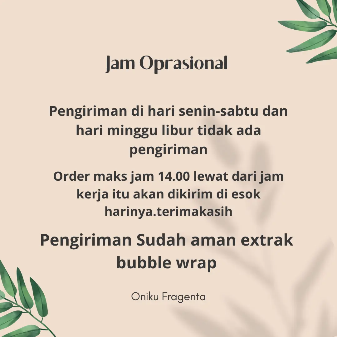 Parfum ini menggunakan konsentrat impor asli Eropa dan alkohol khusus untuk parfum, menghasilkan kualitas aroma yang memuaskan. Dengan volume 30ml, parfum ini praktis untuk dibawa ke mana saja. Pilihan variasi yang beragam memungkinkan Anda menemukan aroma yang paling sesuai dengan gaya Anda.