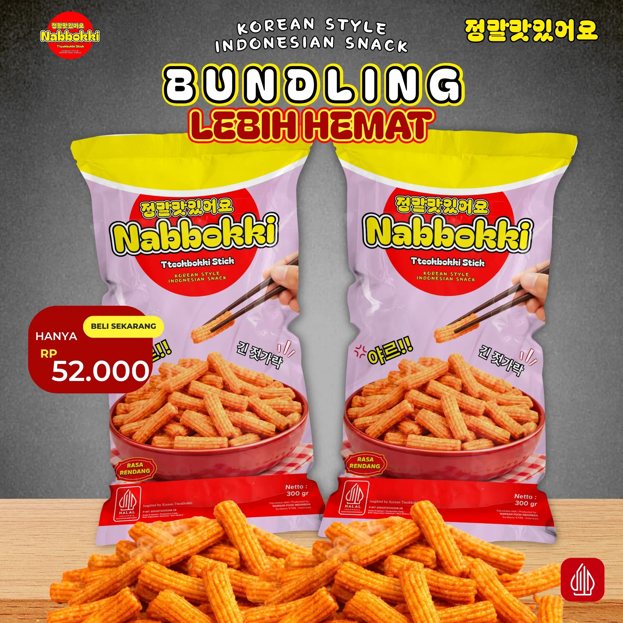 NABOKKI adalah snack stick ala tteokbokki Korea yang dipadukan dengan cita rasa khas Indonesia. Teksturnya renyah, tebal, dan bumbu nempel, cocok untuk semua momen ngemil.