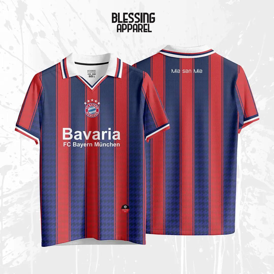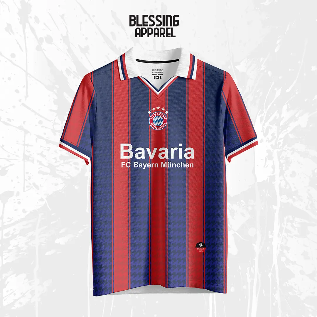 - Motif: Desain vintage dengan logo FC Bayern München klasik dan pola garis-garis khas FC Bayern München