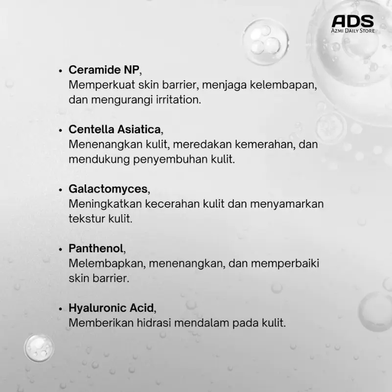 Ceramide NP: Memperkuat skin barrier, menjaga kelembapan, dan mengurangi irritation.