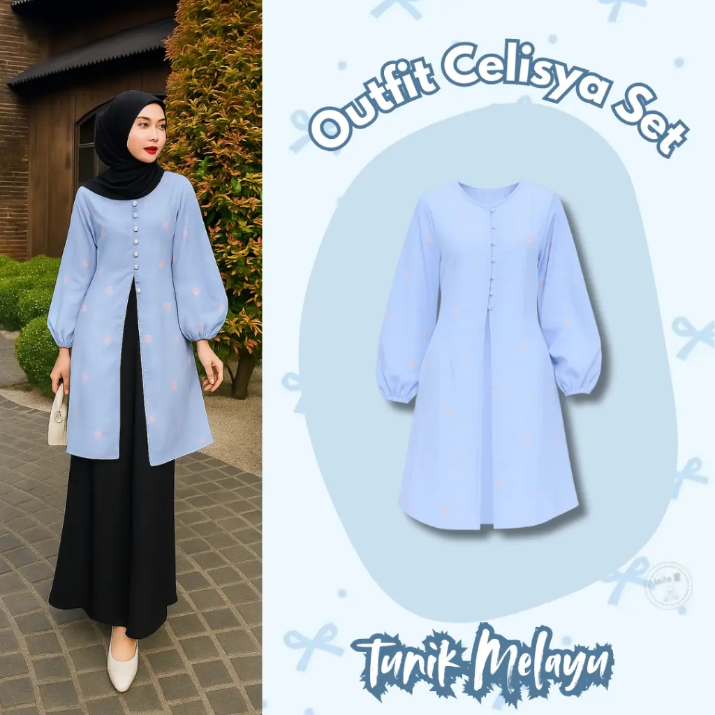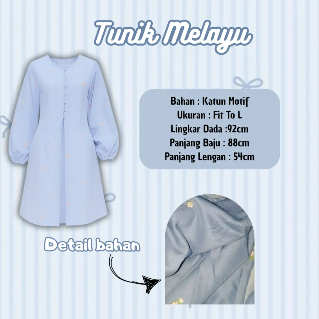 ~ Tunik Melayu Biru - Tampil Anggun Dan Feminin Dengan Tunic Dress Berwarna Biru Pastel Yang Dihiasi Motif Bunga Kecil Yang Manis.
