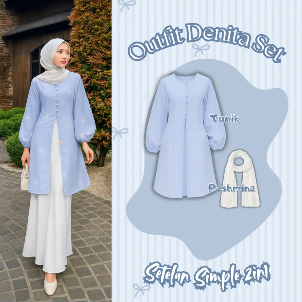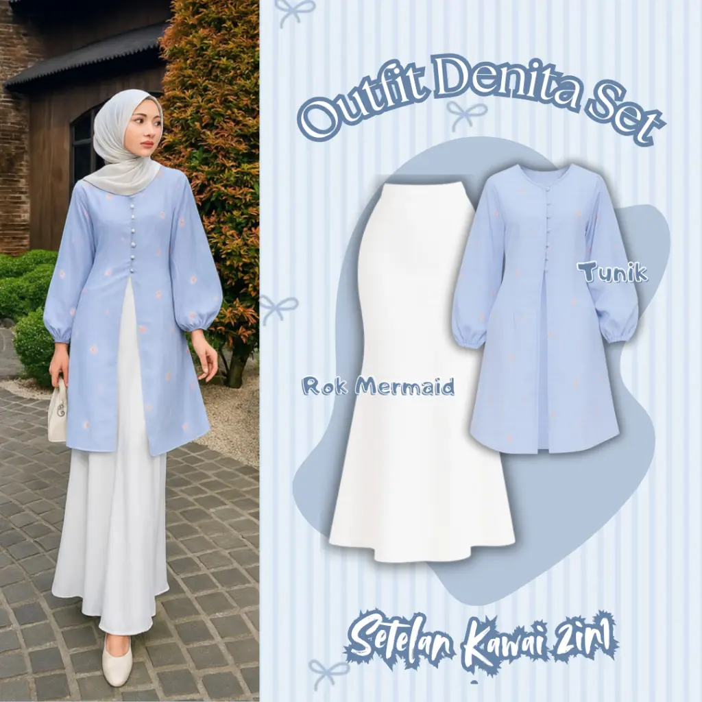 Outfit Wanita 3in1 Denita Set - Tunik Melayu, Rok Mermaid, Pashmina Ceruti Perpaduan warna biru pastel dan putih menciptakan look yang fresh, cocok untuk acara formal, kondangan, pengajian, atau sekadar tampil rapi di kegiatan sehari-hari. Bahan nyaman, jatuh, dan adem dipakai seharian sehingga membuatmu tampil percaya diri di setiap momen.