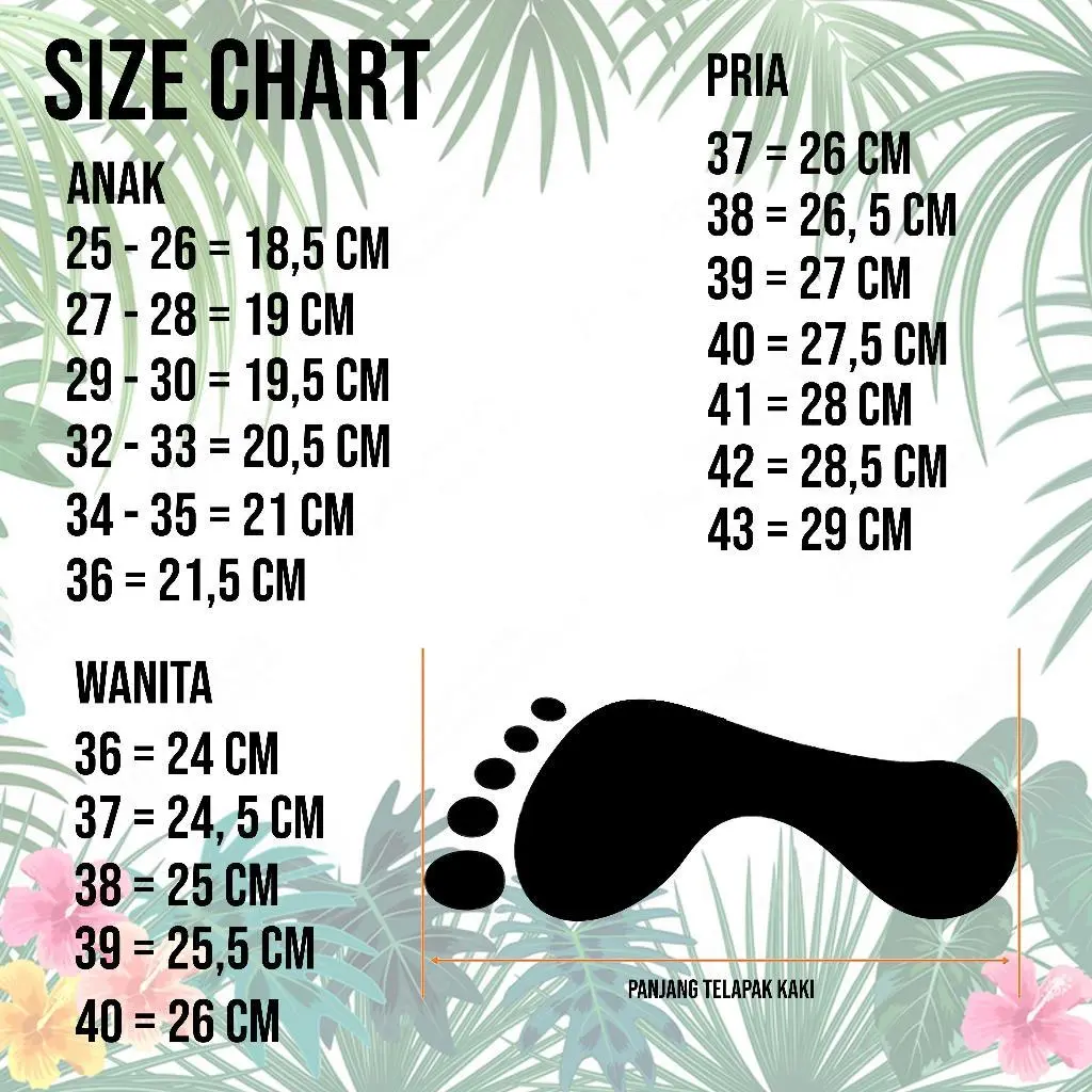 Ukuran ini adalah ukuran sol BUKAN UKURAN KAKI.