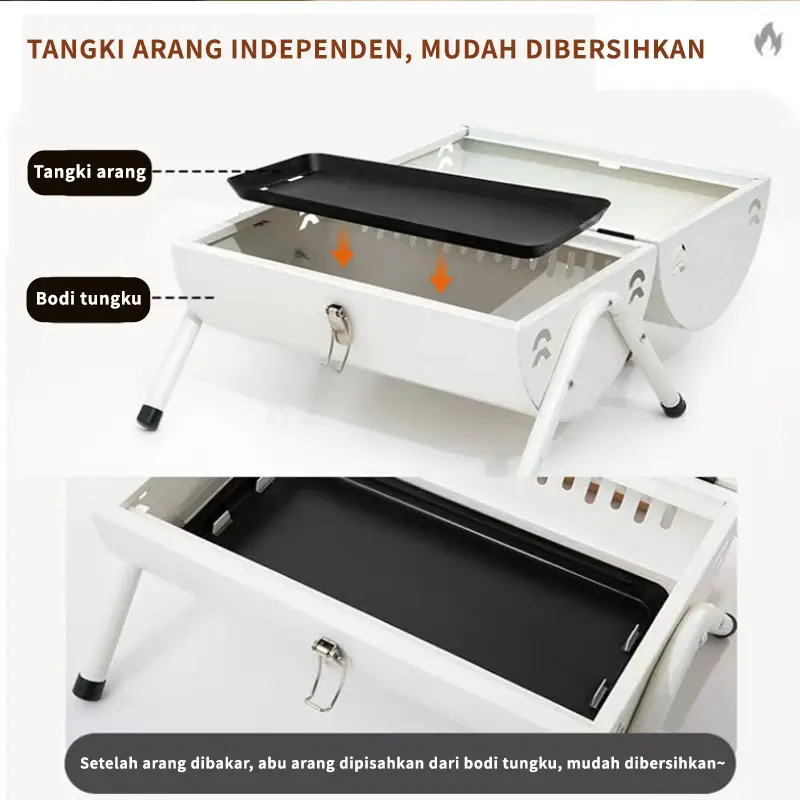Masukkan tangki arang ke dalam badan tungku terlebih dahulu, lalu tambahkan arang agar arang tidak bersentuhan langsung dengan badan tungku, menghindari luka bakar.