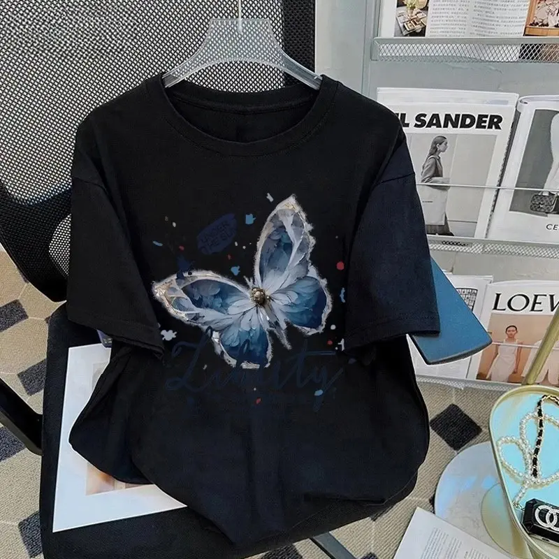 5. 【COD|24s Katun 100%|200g】- | Korean style Kupu-kupu print Anti-Uv50 T-shirt |Kapas Kinetics-New| Kaos Keren Trendy Mudabaju istri orang terbaru 2026|Kaos|Hitam & Putih|Regular|Cotton Combed 24s|Kaos distro dewasa