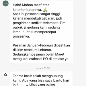 Saya pesan lebih dari 30 hari niat buat Lebaran malah ga kepake dan beli baju lain, dijanjikannya sebelum Lebaran sampe nyatanya Lebaran lewat seminggu seharusnya kalo overload ga usah PO terlalu banyak
