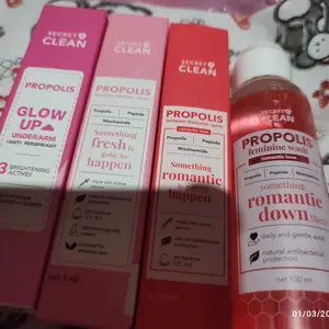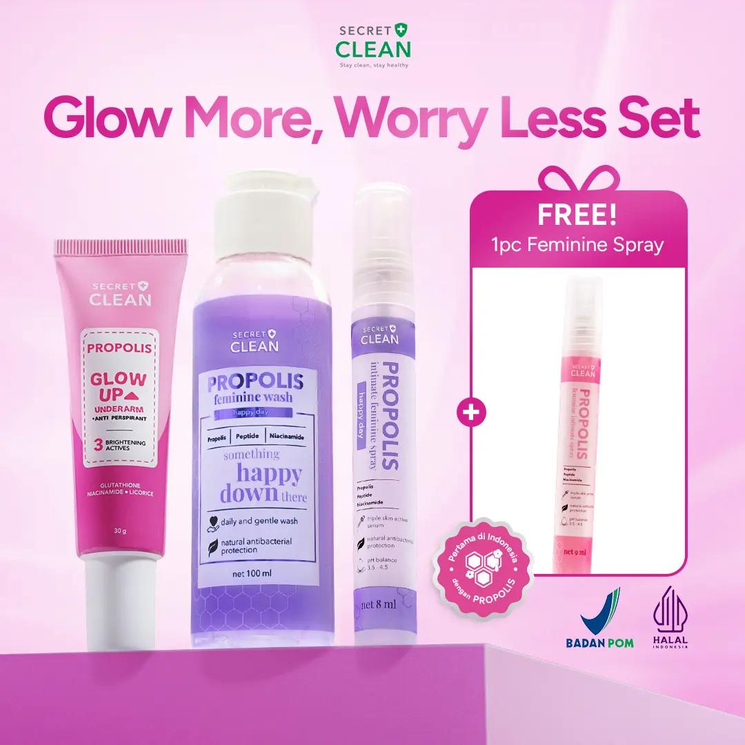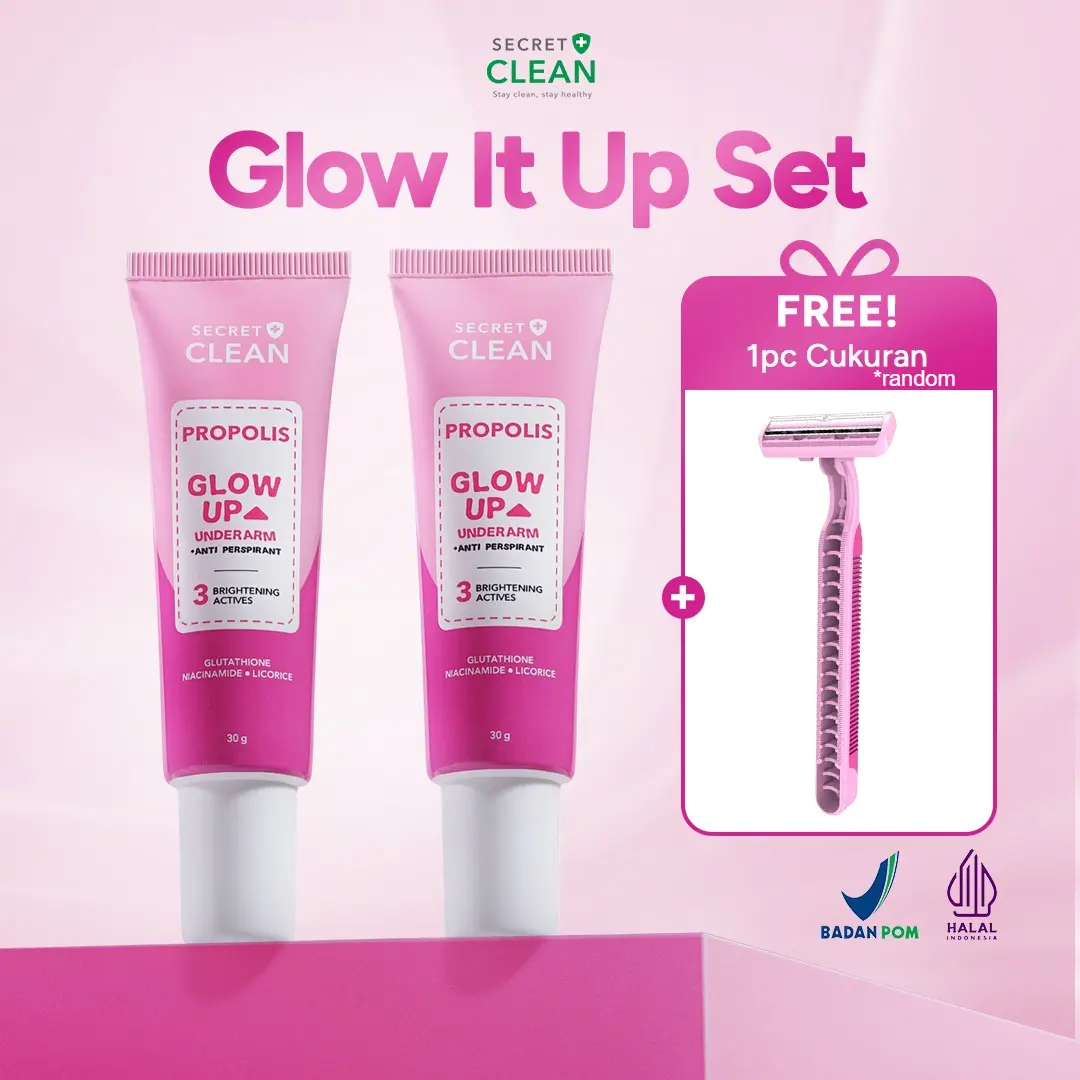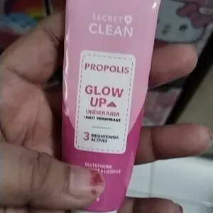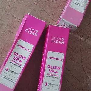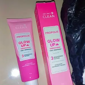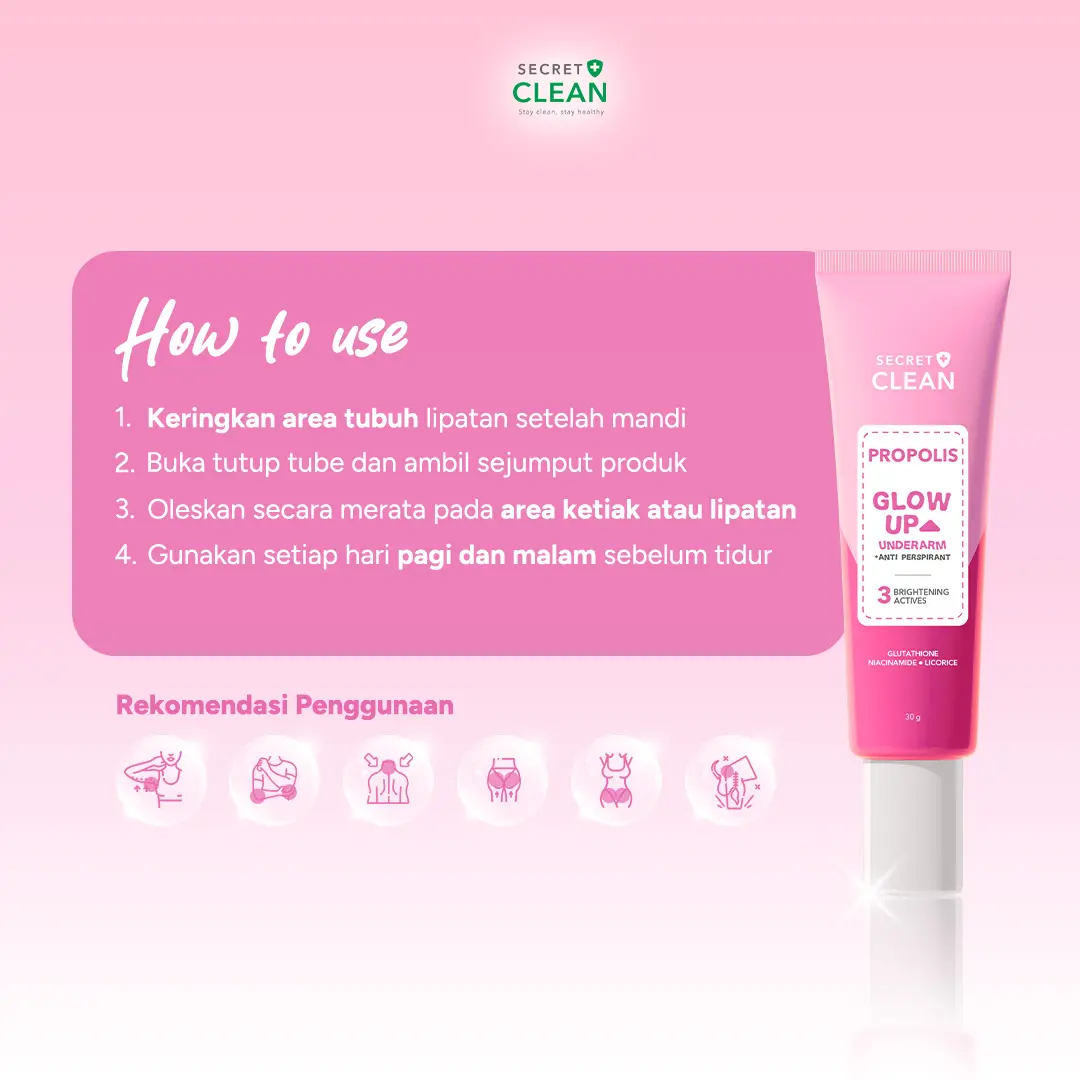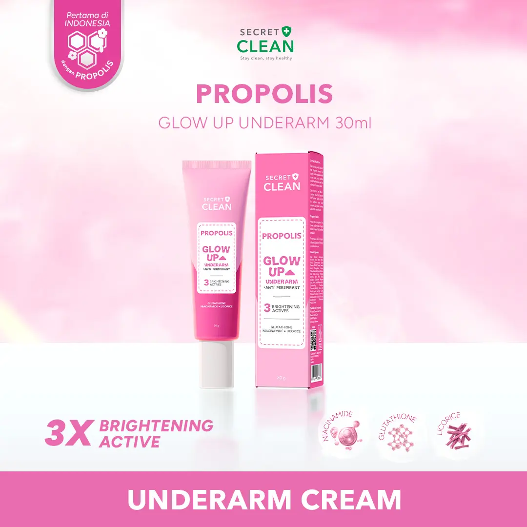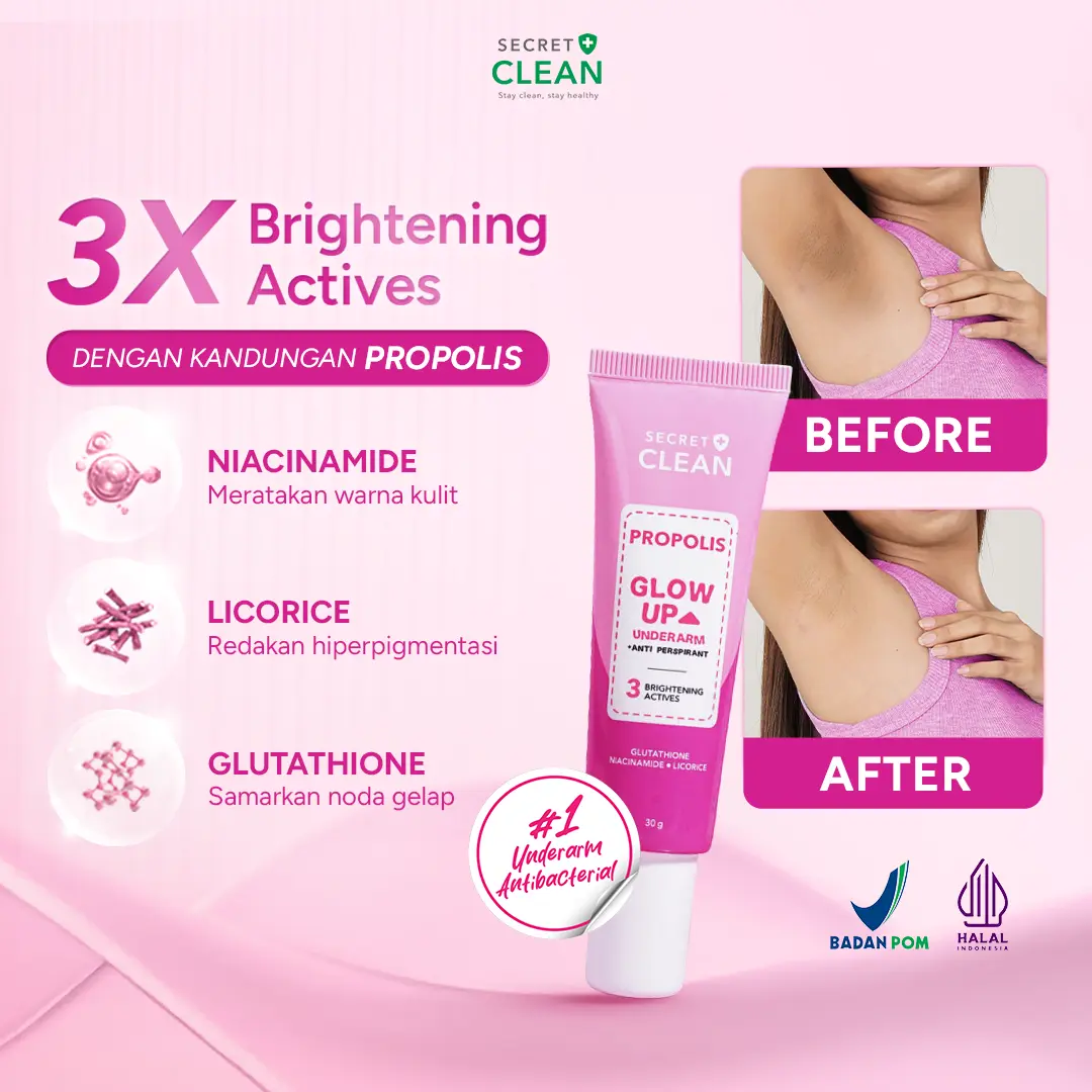 Secret Clean Propolis Glow Up Underarm mengandung Anti-Bacterial alami untuk melindingi kulit area lipatan dan selangkangan dari bakteri dan jamur yang menyebabkan kulit menghitam dengan 3x Brightening Active Glutathione, Niacinamide & Licorice.