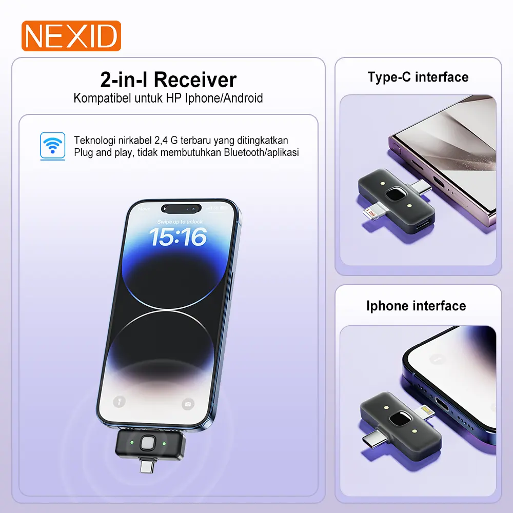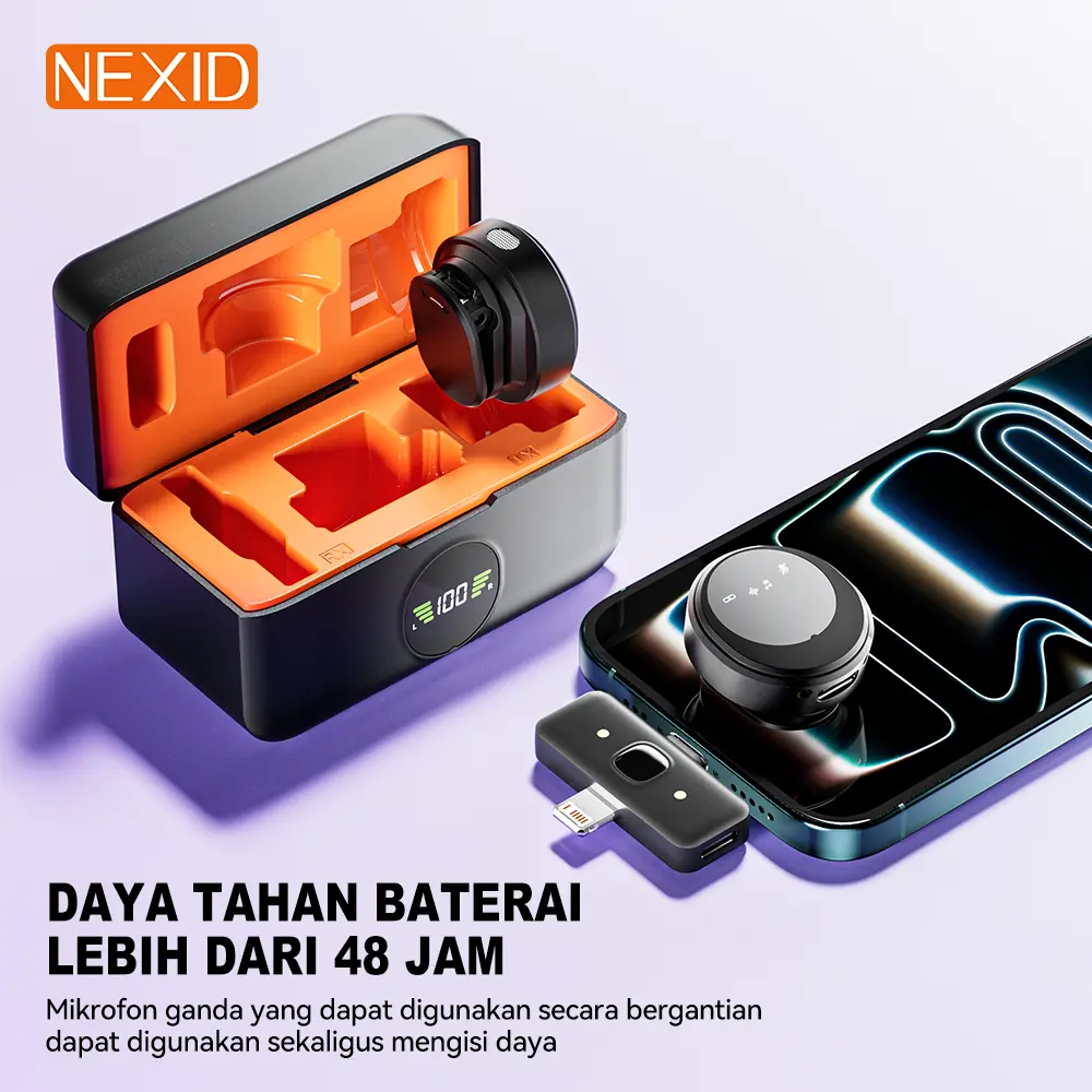 NEXID Wireless Microphone 2-In-1 Clip On Profesional Mic Magnetic Mikrofon Play dengan Charging Case Dual Lavalier Magnetic Plug Play Live Stream HP Plug Play Peredam Kebisingan 2 Mic untuk Recording Video Untuk Live TikTok YouTube