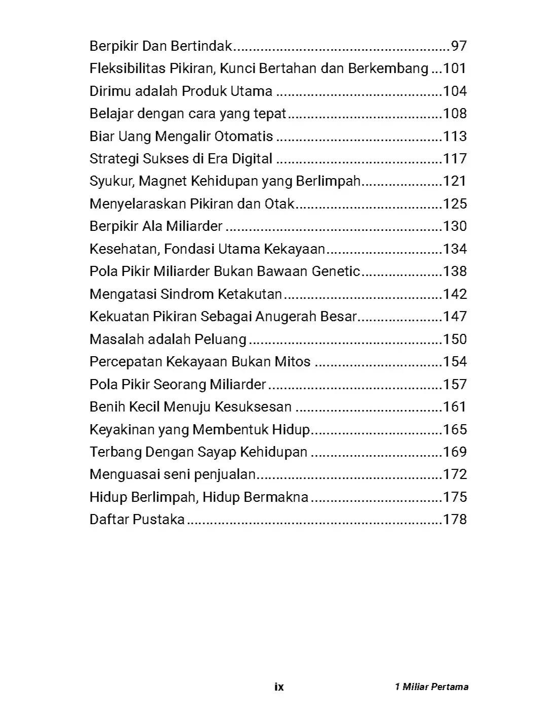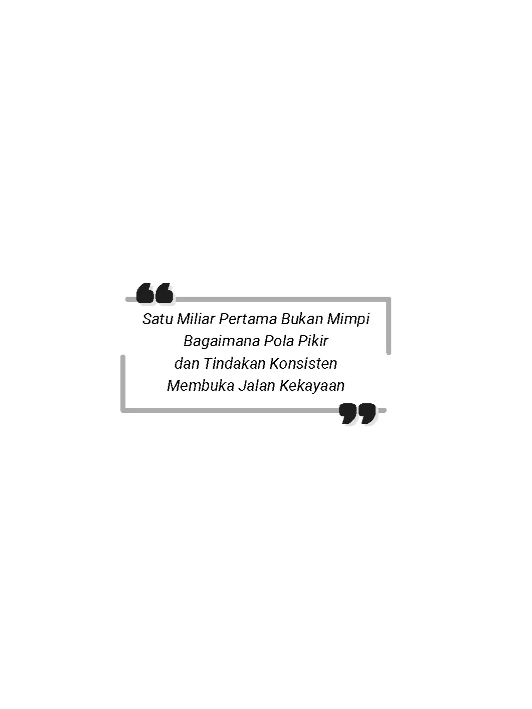 Buku 1 Miliar Pertama mengulas pola pikir, kebiasaan, dan taktik finansial yang jarang dibahas secara terbuka, tetapi memiliki pengaruh besar terhadap arah hidup seseorang. Buku ini tidak menjanjikan jalan pintas atau kesuksesan instan, melainkan mengajak pembaca membangun fondasi keuangan melalui proses yang realistis, disiplin, dan berkelanjutan.