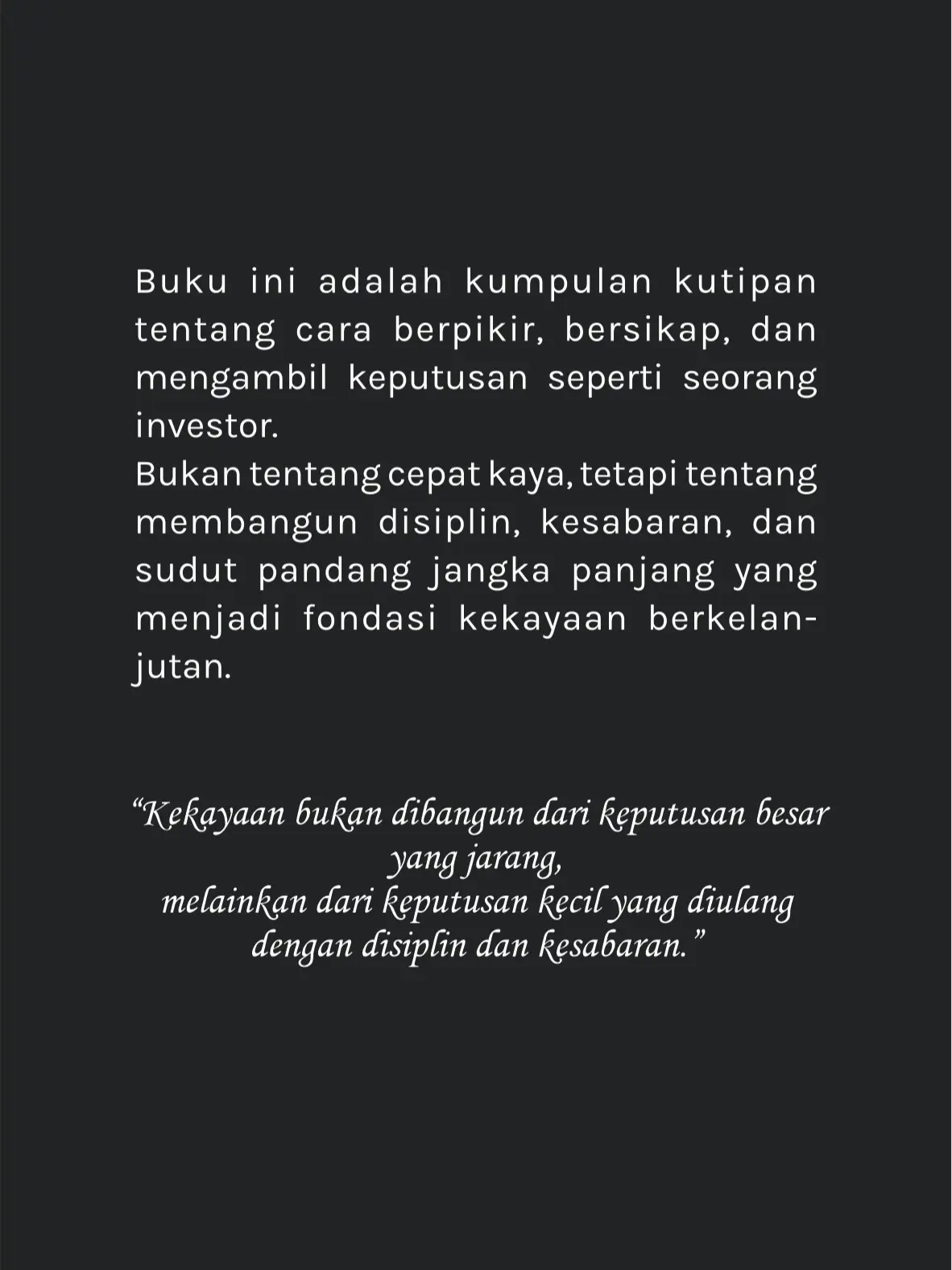 Isinya disusun untuk dibaca perlahan, dipahami, lalu diterapkan sesuai konteks hidup masing-masing pembaca. Buku ini membahas cara berpikir tentang uang, mengelola risiko, menciptakan penghasilan, serta mengambil keputusan finansial secara rasional. Cocok bagi karyawan, pebisnis pemula, mahasiswa, maupun siapa pun yang ingin berhenti sekadar bekerja untuk uang dan mulai memegang kendali atas masa depan finansialnya sendiri.