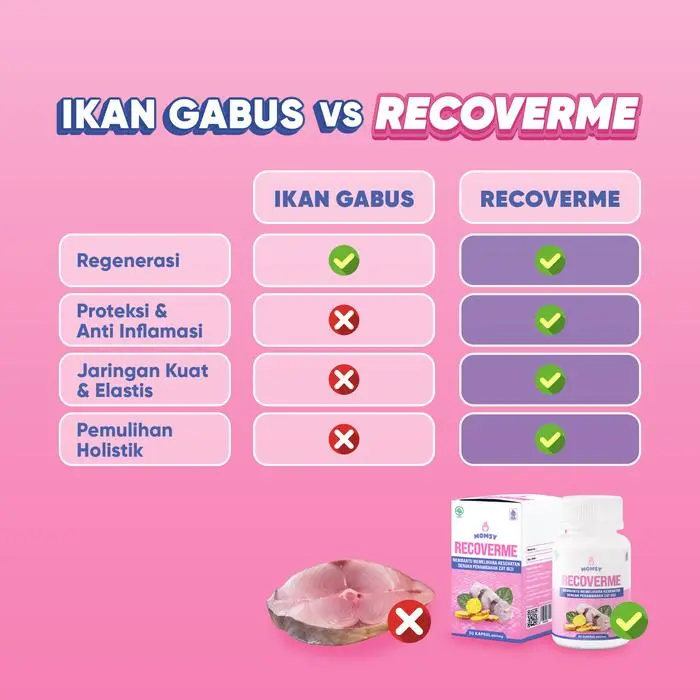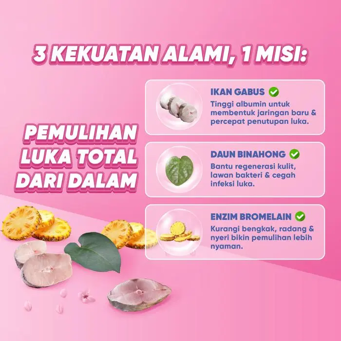 Recoverme merupakan #1st Herbal Formula di Indonesia dengan kombinasi 3 Bahan Aktif Alami (Ikan Gabus, Daun Binahong & Enzim Bromelain) yang diformulasikan khusus untuk membantu pemulihan luka dari dalam tubuh. Dirancang untuk ibu pasca melahirkan (normal/SC), luka jahitan, luka operasi, hingga luka infeksi agar pulih lebih cepat, lebih bersih, dan lebih kuat. Keunggulan Recoverme #1st Kombinasi 3 Herbal Aktif untuk penyembuhan luka Cepat kering tanpa meninggalkan infeksi atau bengkak Bantu meminimalkan nyeri & bekas luka (jahitan, SC, episiotomi) Aman untuk ibu menyusui – tidak mengganggu produksi ASI Telah melalui proses uji & diproduksi bersertifikat BPOM Kandungan Utama & Fungsinya Ikan Gabus (Albumin Tinggi) Membentuk jaringan baru & mempercepat penyembuhan Mendukung pemulihan jaringan otot & luka dalam Daun Binahong Meregenerasi jaringan dan memperkuat pembentukan kolagen Bersifat antibakteri & antiinflamasi Enzim Bromelain Membantu mengurangi bengkak & lebam Pemulihan lebih nyaman dan minim nyeri Aturan Konsumsi Minum 3 kapsul per hari Legalitas Produk BPOM: POM TR243073441 Isi: 30 Kapsul per botol Recoverme – Pulih Cepat, Sembuh Sempurna.