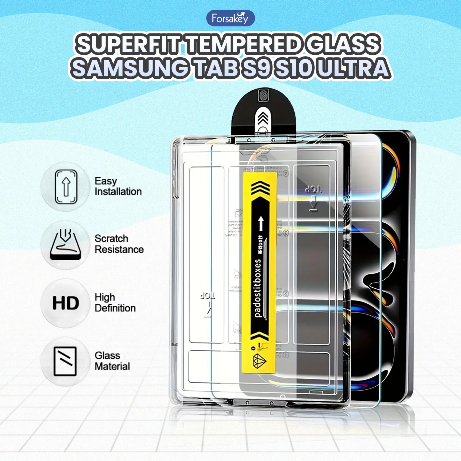 - Sejajarkan tablet agar menghadap ke arah yang benar, tutupi kompartemen bebas debu dengan film.