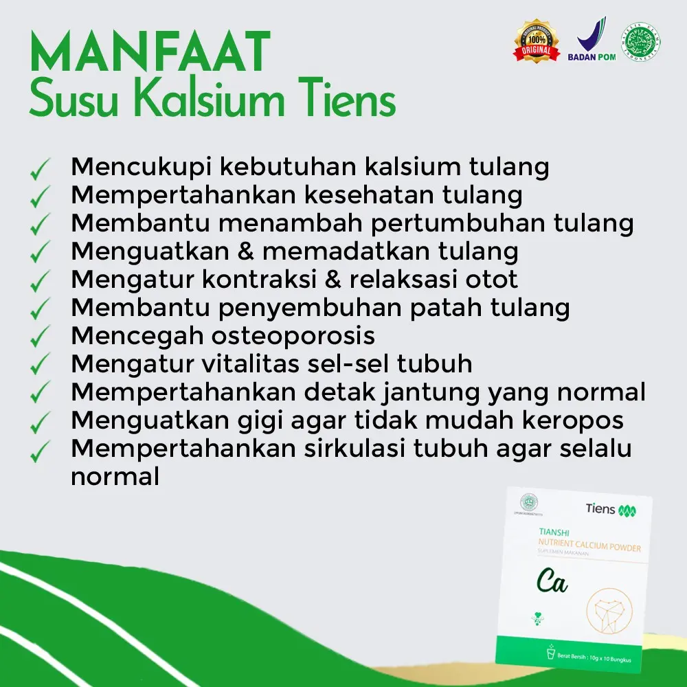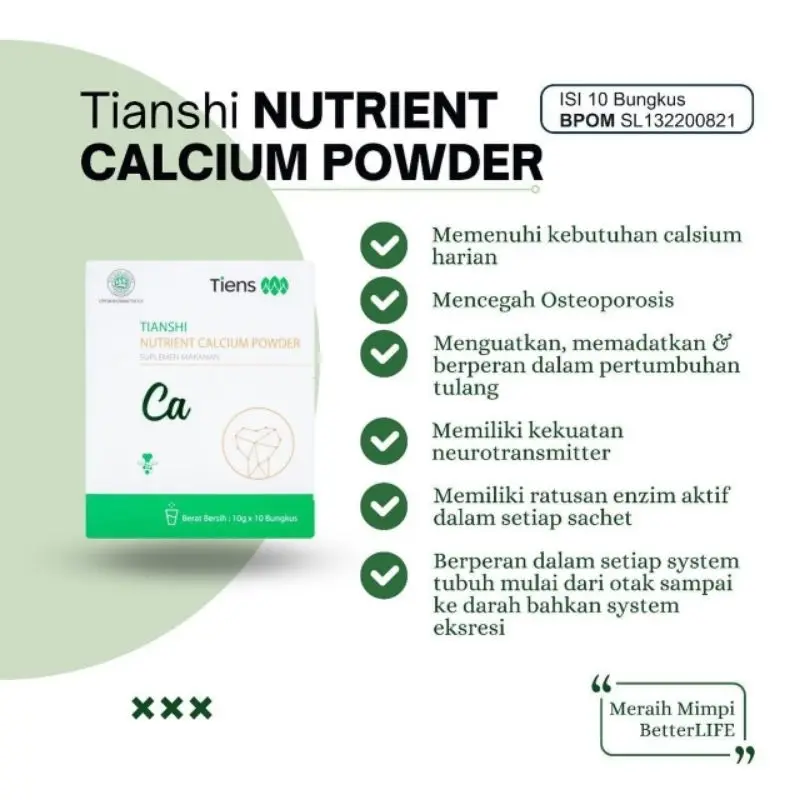 Penuhi kebutuhan kalsium harian Anda dengan Nutrient Calcium Powder Tiens, suplemen berbentuk bubuk yang praktis dikonsumsi dan mudah larut.