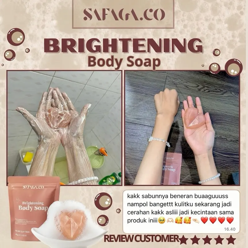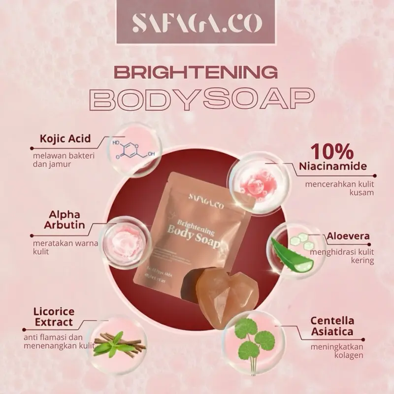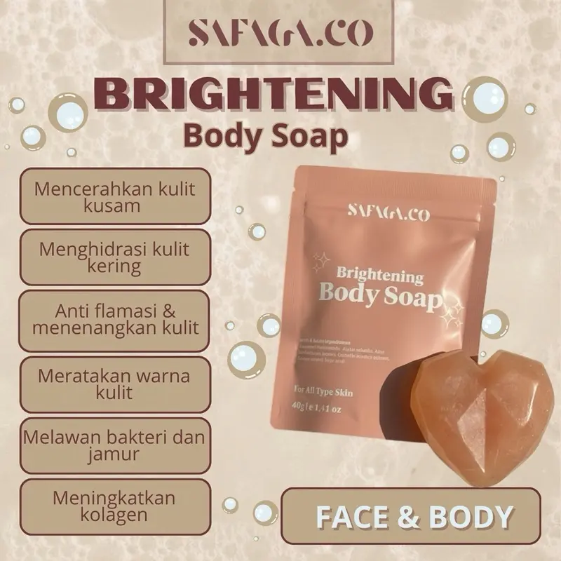 SAFAGA.CO Sabun pencerah wajah & badan Brightening Body Soap 10% Niacnamide, Collagen, kojic acid, alpha arbutin, untuk Semua Jenis Kulit