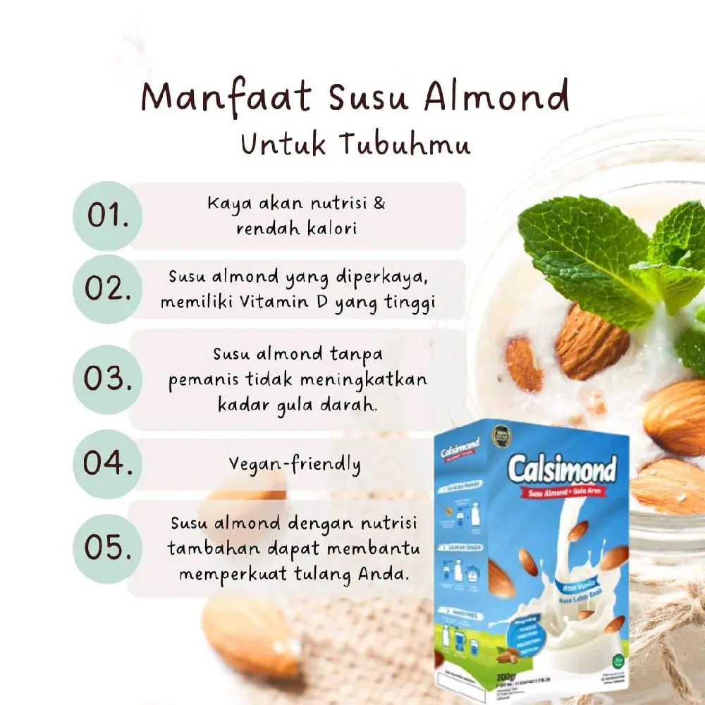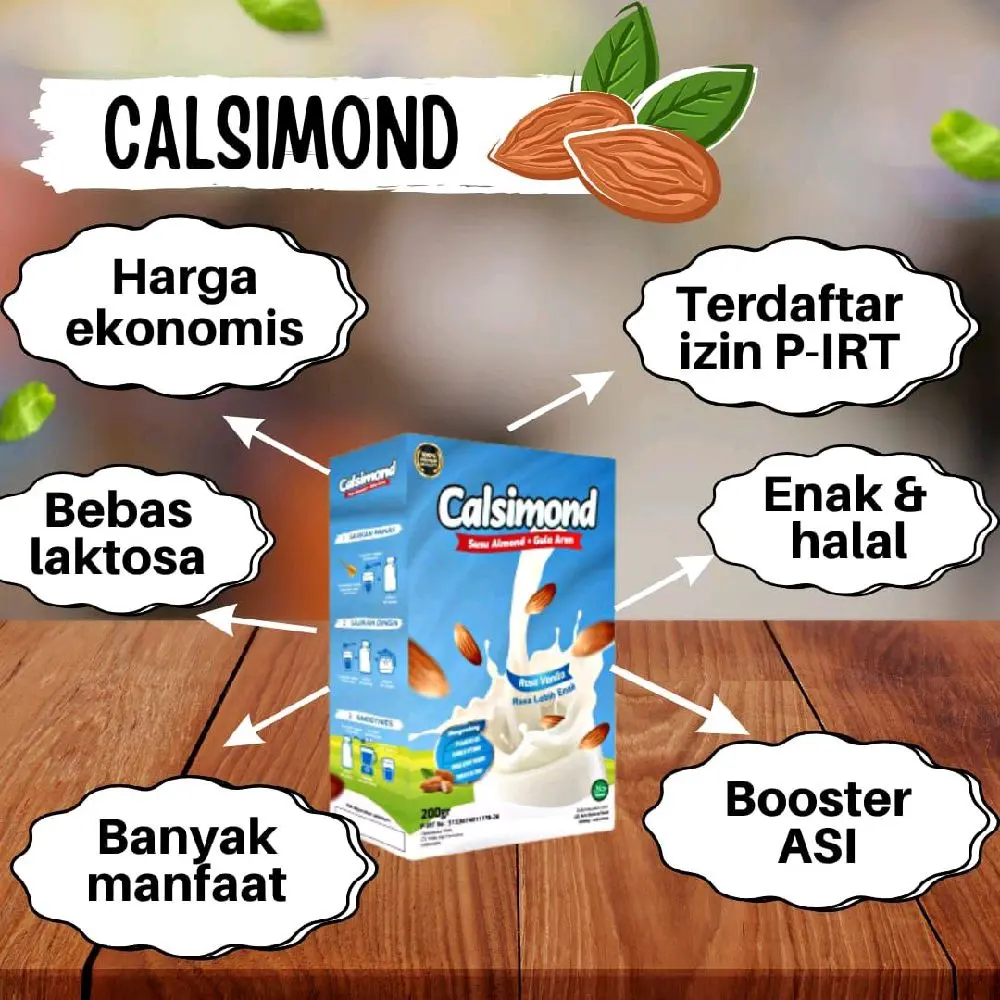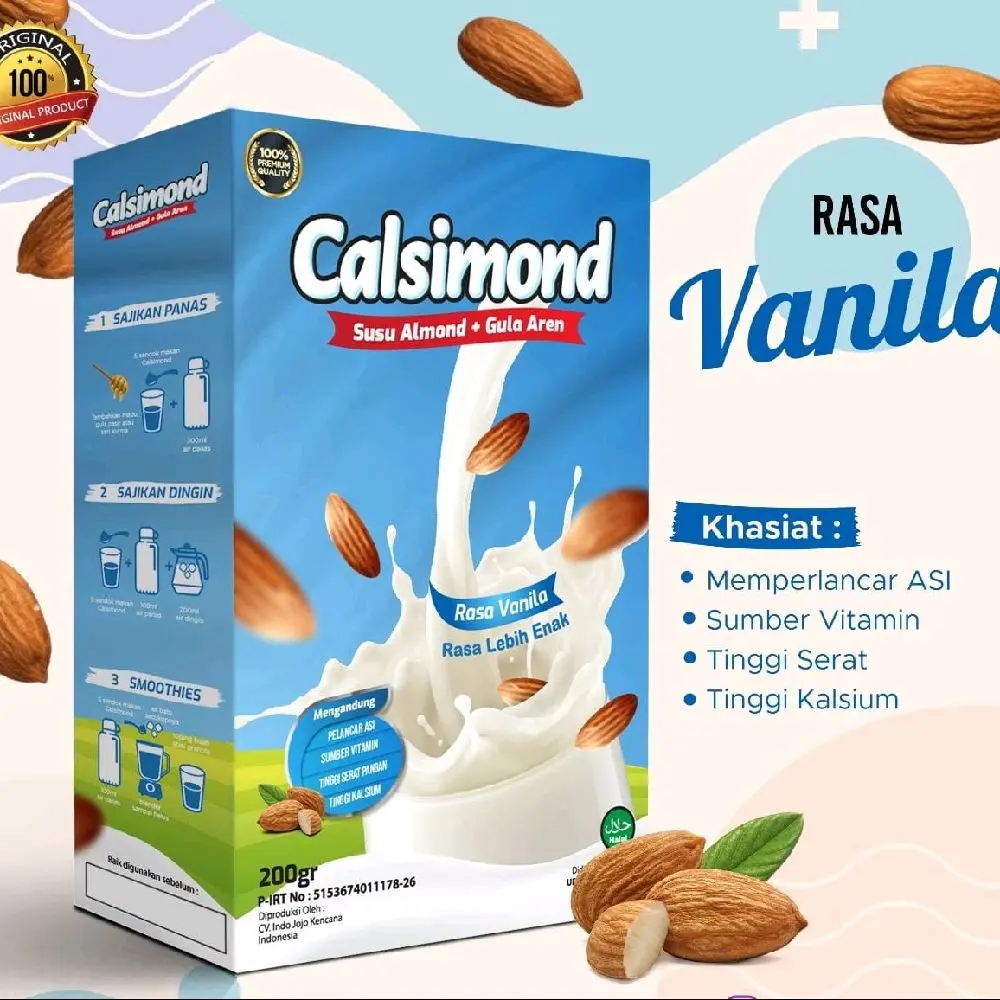 Calsimond adalah susu almond yang terbuat dari ekstrak buah almond pilihan yang di kombinasi dengan gula aren. Perpaduan ekstrak almond dan gula aren menjadikan rasa manis alami yang pas dan sehat.