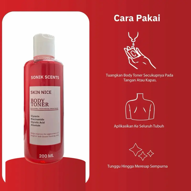 Bosan dengan kulit kusam dan tekstur kasar? Sonik Scents Skin Nice Body Toner hadir dengan formula baru yang lebih besar (250ml) untuk memberikan perawatan kulit tubuh yang menyeluruh. Toner ini dirancang khusus untuk mengangkat sel kulit mati sekaligus memberikan hidrasi mendalam, membuat kulit tampak lebih cerah, bersih, dan bercahaya.