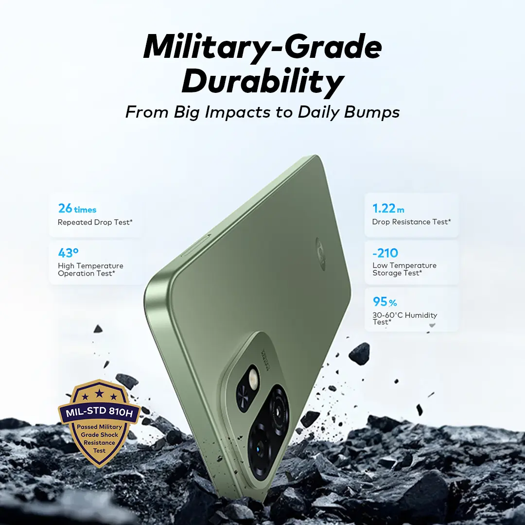 A100C hadir dengan desain kokoh bersertifikasi Military-Grade Shockprooff, membuatnya aman dari benturan dan jatuh saat aktivitas harian. Cocok untuk kamu yang aktif, dinamis, dan butuh HP yang benar-benar Tangguh dan ketahanan kelas Militer dengan Harga Tetap Ramah di kantong.