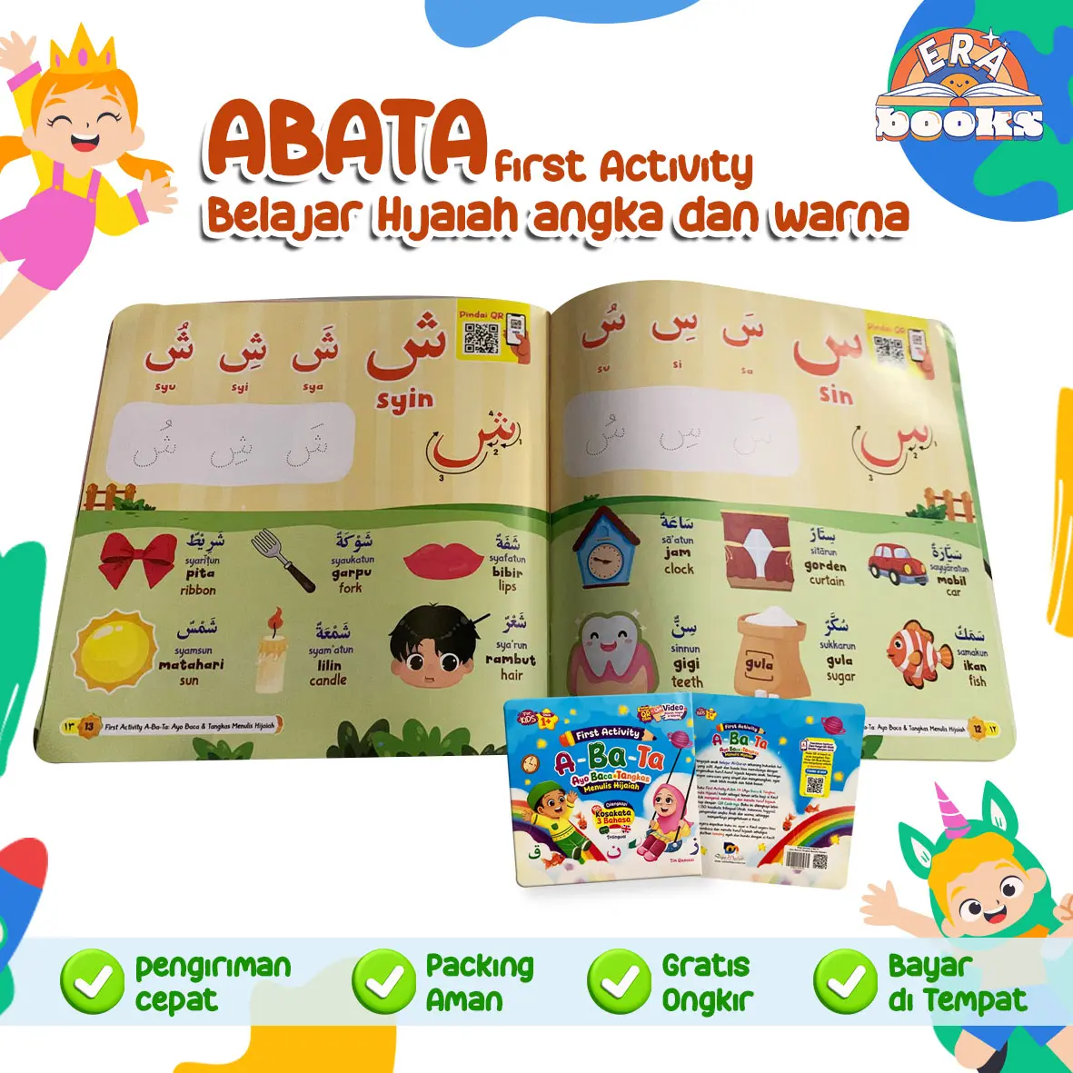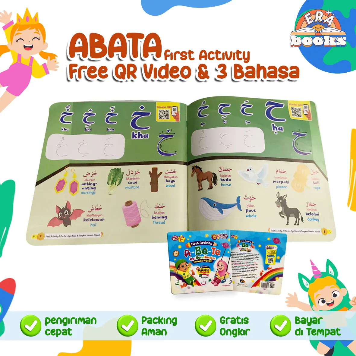 Anak diajak menulis dan membaca huruf hijaiyah secara bertahap melalui aktivitas menebalkan, visual full color, serta QR Code audio di setiap halaman yang membantu anak mendengar cara membaca dan menulis dengan benar.
