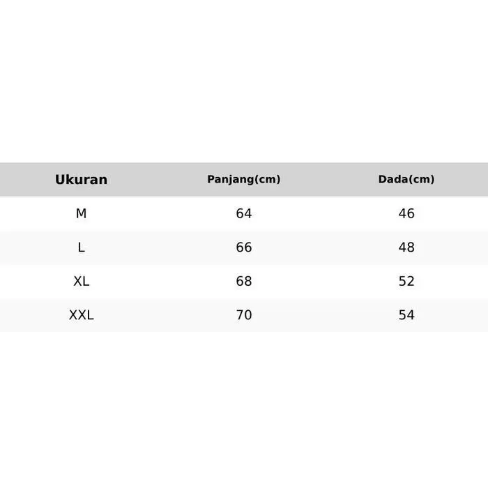 Ukuran & Rekomendasi Berat BadanM = P 64 x L 46 = BB 40-50KGL = P 66 x L 48 = BB 50-60KGXL = P 68 x L 52 = BB 60-80KGXXL = 70 x L 54 = BB 80-90KG