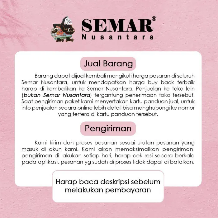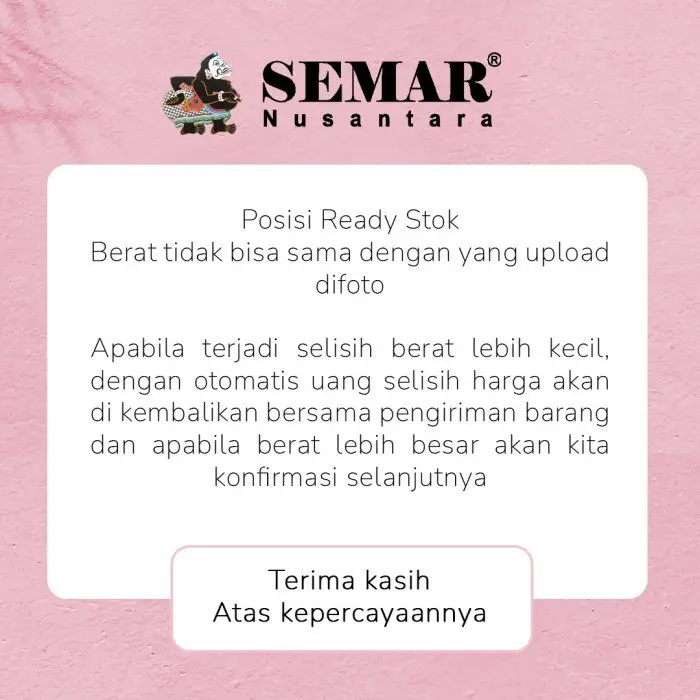 -Khusus Member: Punya member Semar Nusantara? Wajib tulis nama & nomor member di notes saat checkout ya, supaya poinnya masuk Kalau datanya tidak ditulis saat order, sayang sekali poinnya tidak bisa direkap susulan.