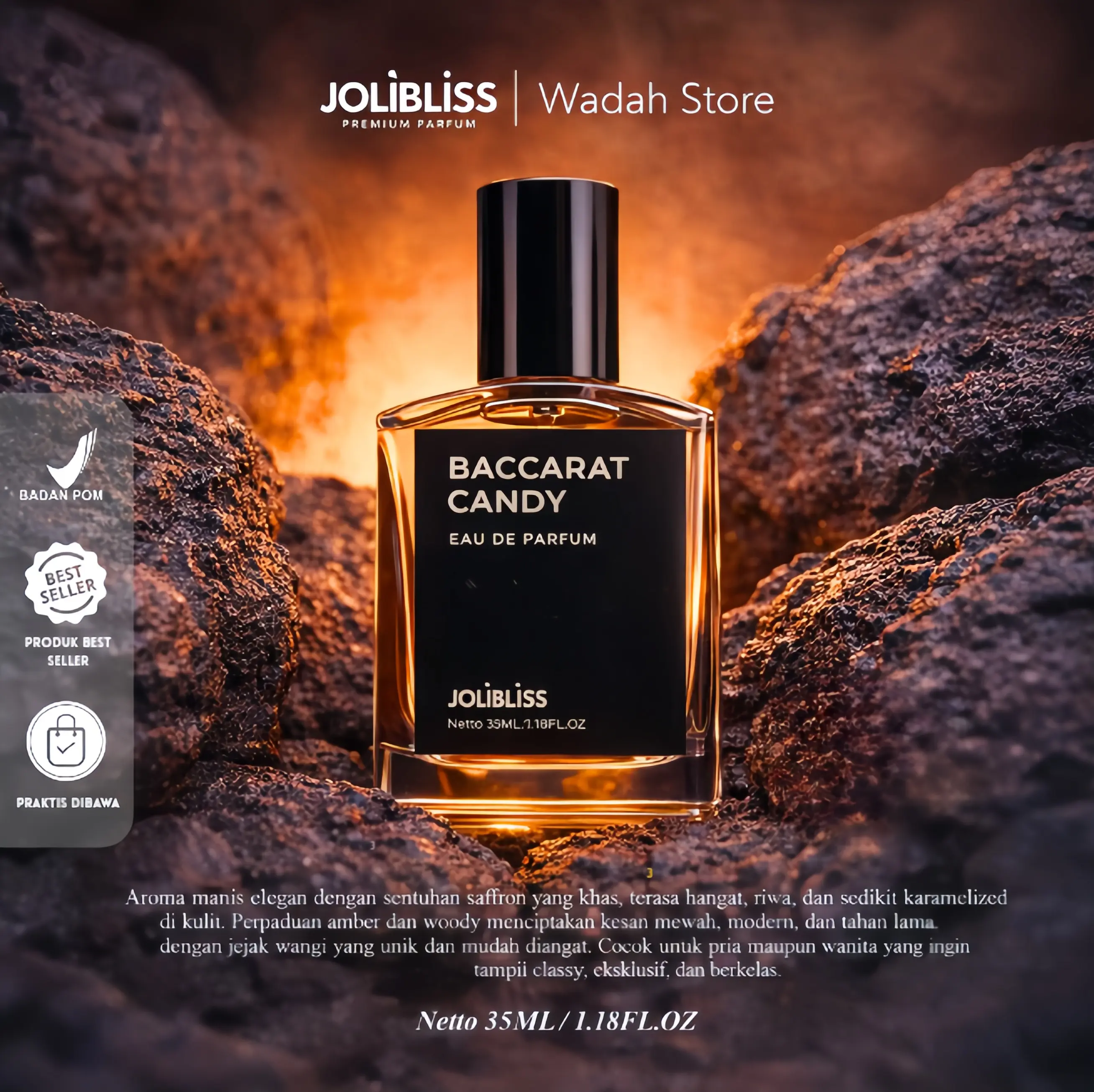 Aroma manis elegan dengan sentuhan saffron yang khas, terasa hangat, riwa dan sedikit karamelized di kulit. Perpaduan amber dan woody menciptakan kesan mewah, modern, dan tahan lama dengan jejak wangi yang unik dan mudah diingat. Ccocok untuk pria maupun wanita yang ingin tampil calssy, eksklusif, dan berkelas.