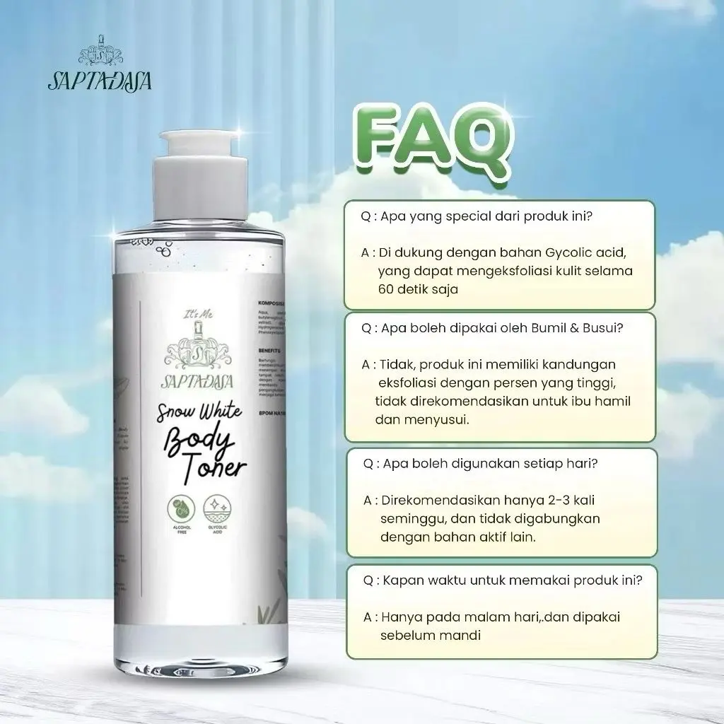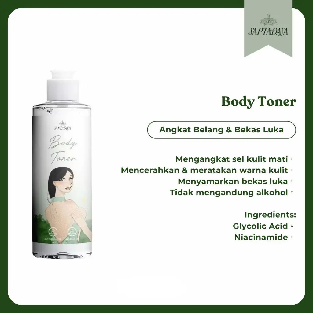 toner Saptadasa dengan kandungan AHA + Niacinamide yang bantu cerahkan kulit tidak merata, kusam, & lipatan gelap.