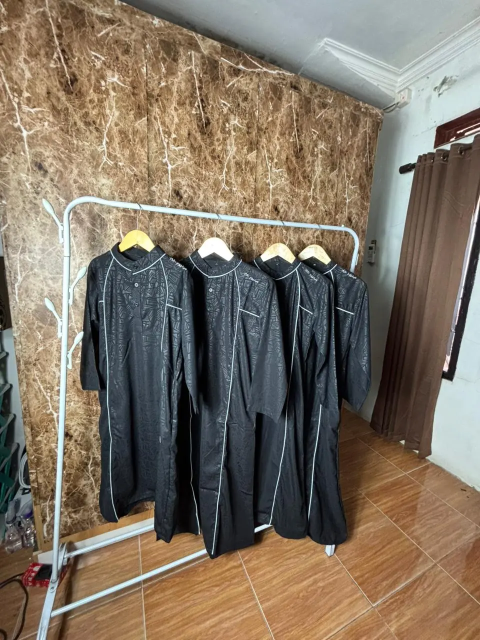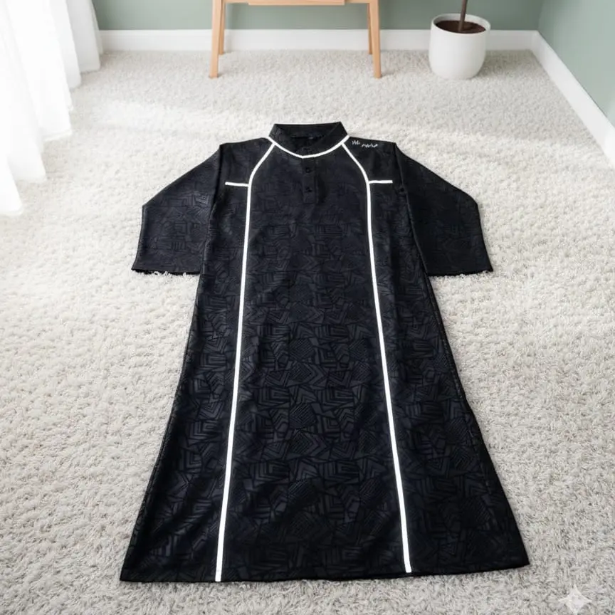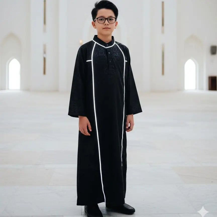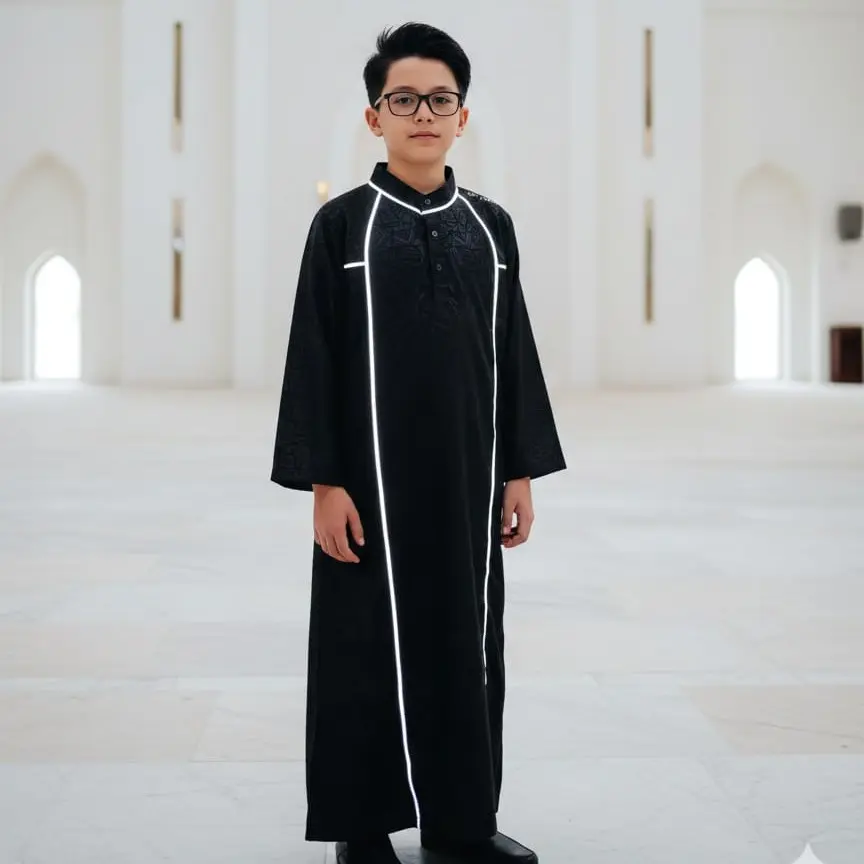 Gamis jubah anak terbaru dengan desain eksklusif yang membuat si kecil tampil tampan, nyaman, dan percaya diri. Didesain stylish dengan sentuhan motif strip reflektif yang dapat menyala saat terkena cahaya lampu atau flash, memberikan kesan modern sekaligus menarik.