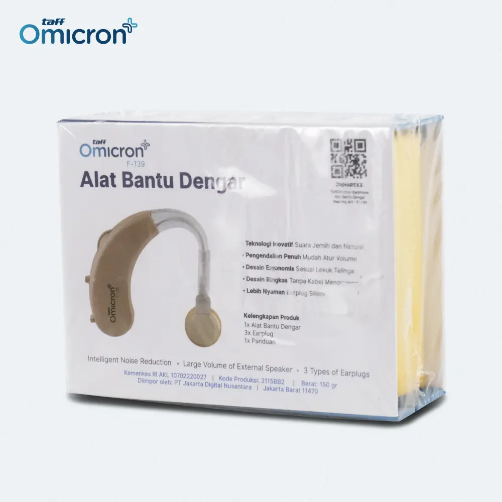 Alat bantu dengar TaffOmicron menggunakan desain in ear ergonomis yang mengikuti kontur telinga pengguna. Posisi pemasangan yang pas membantu suara langsung diarahkan ke gendang telinga sehingga terdengar lebih jelas dan fokus. Bentuknya juga tidak mencolok sehingga tetap nyaman digunakan di berbagai situasi.