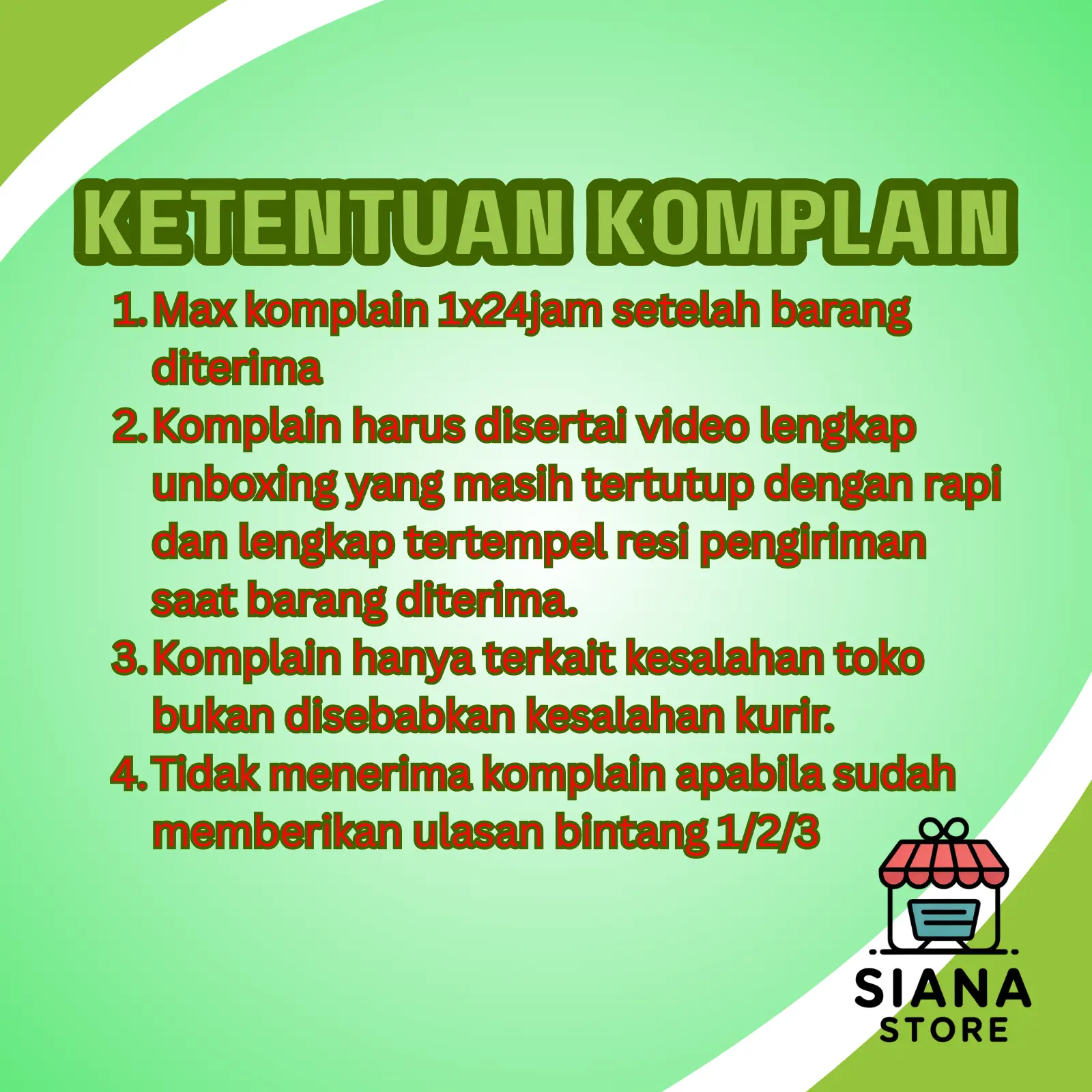 - Tidak menerima komplain apabila sudah memberikan ulasan bintang 1/2/3