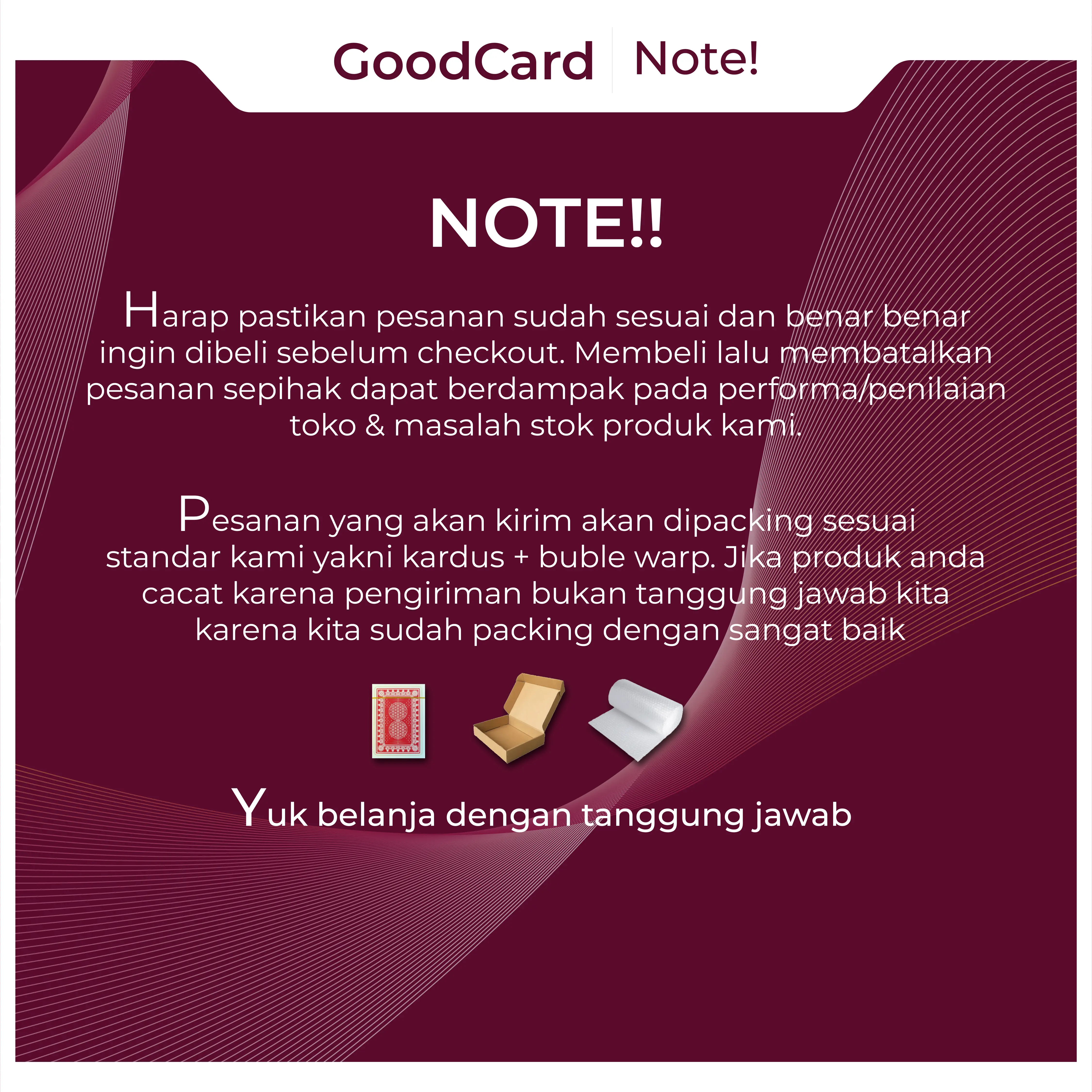Kartu dikirim dalam kardus + bubble warp yang aman. Kerusakan saat pengiriman bukan tanggung jawab kami. 📦