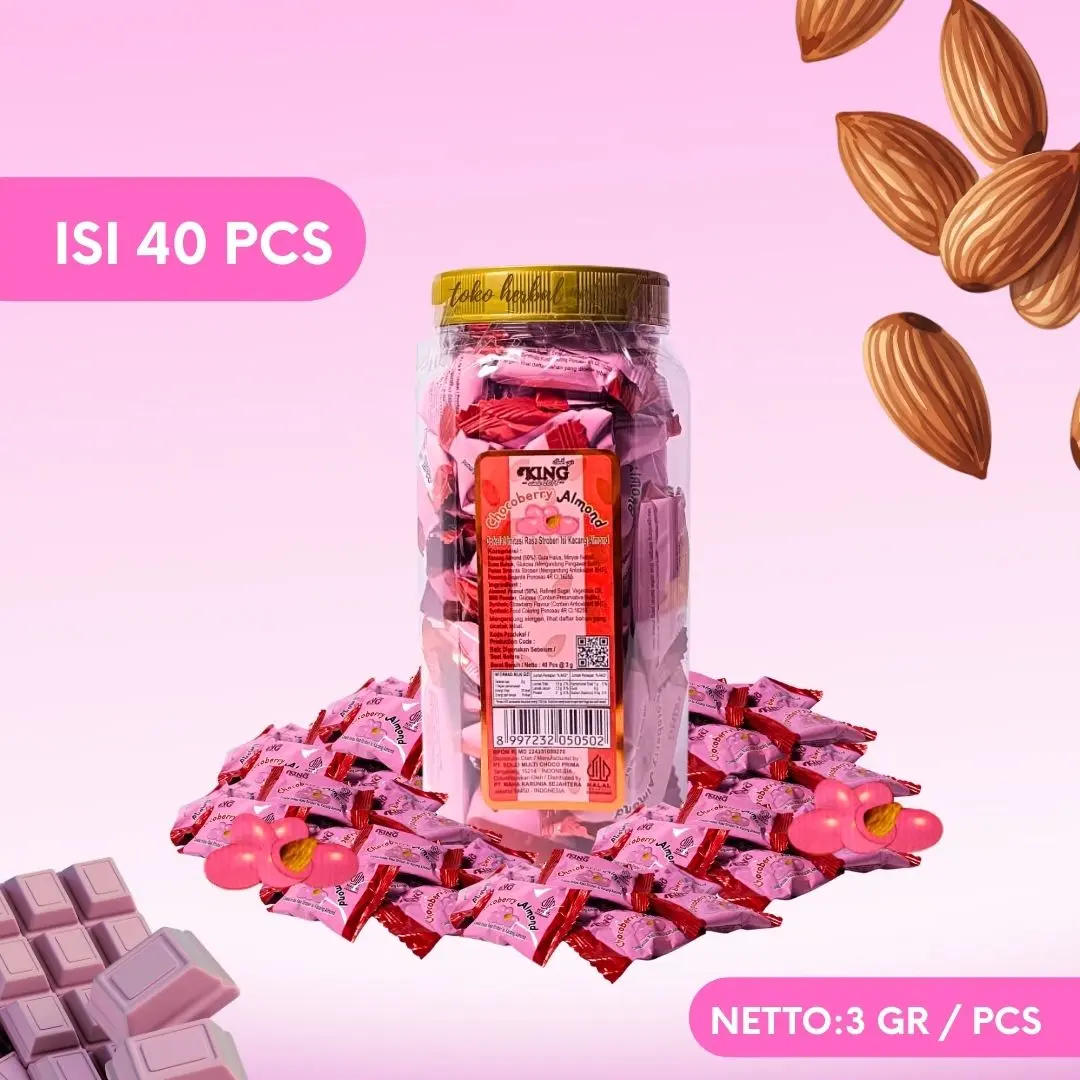 Coklat lezat dengan kacang almond asli yang renyah, perpaduan rasa manis pas dan gurih yang bikin nagih. Cocok untuk camilan, suguhan tamu, maupun dijual kembali.