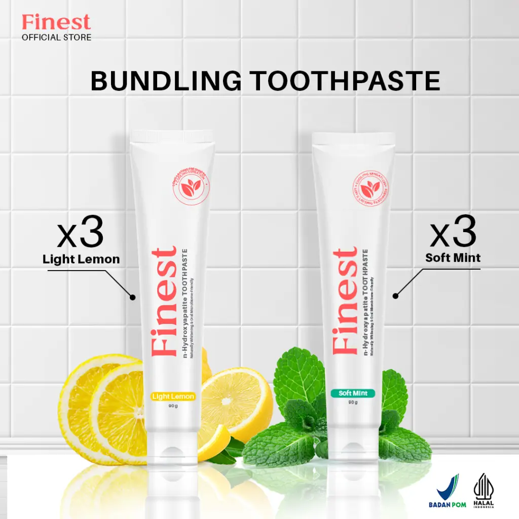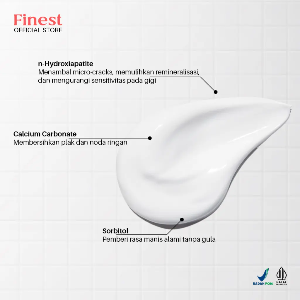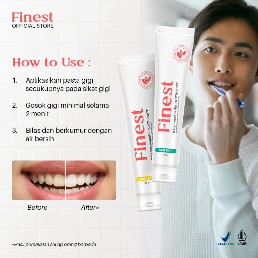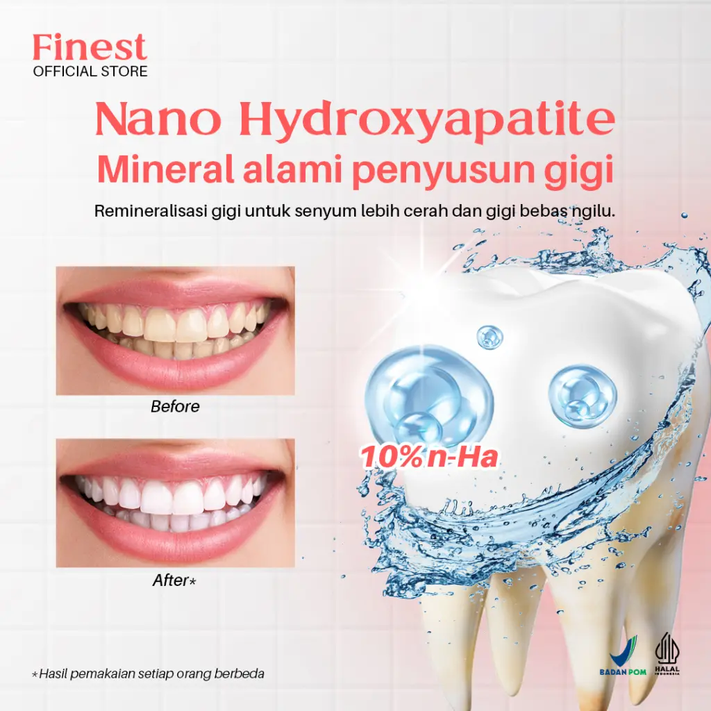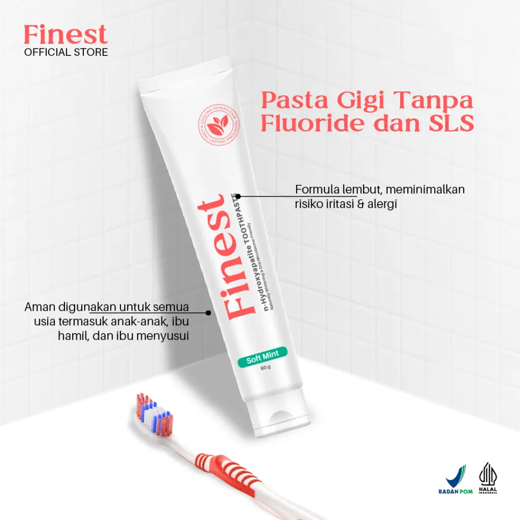 Finest Toothpaste adalah pasta gigi premium dengan teknologi Nano Hydroxyapatite (n-HA) yang mampu memperbaiki enamel, mengurangi sensitivitas, dan menjaga kekuatan alami gigi. Finest diformulasikan tanpa fluoride dan SLS sehingga aman digunakan untuk gigi sensitif, anak-anak, ibu hamil, dan menyusui. Rasa soft mint dan light lemon memberikan sensasi bersih alami dan menjaga napas tetap segar tahan lama.