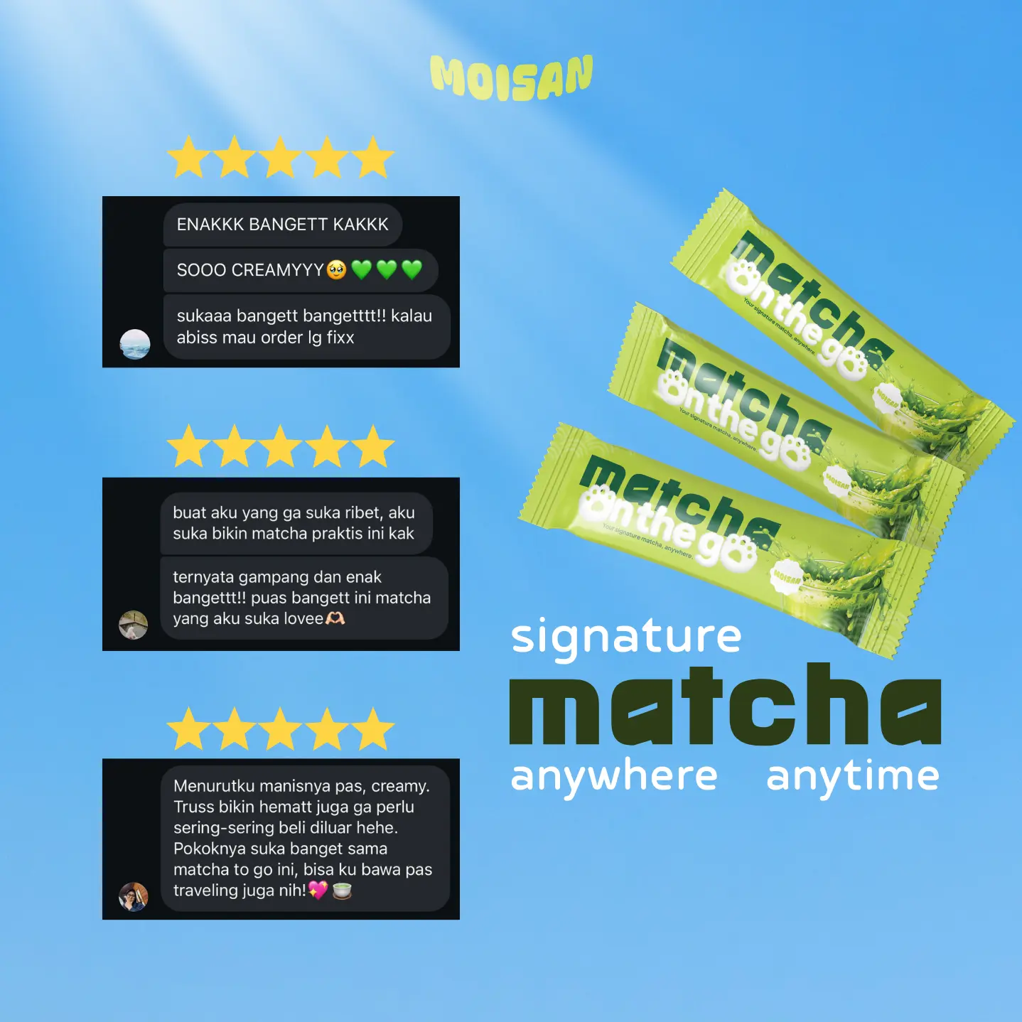 Dibuat dari bubuk pure matcha pilihan yang berasal dari Jepang, Kami menghadirkan matcha latte berkarakter rasa umami yang lembut, sedikit pahit khas matcha autentik, dengan sentuhan manis yang seimbang serta tekstur creamy yang memanjakan. Menggunakan bahan berkualitas tanpa pengawet, pemanis buatan, perisa, maupun pewarna sintetis, menjadikan minuman ini pilihan praktis yang tetap nikmat dan lebih baik untuk tubuh.