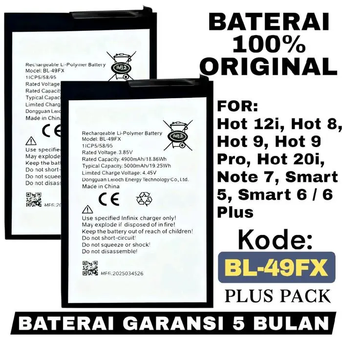 Baterai 100% Original untuk berbagai model ponsel Inf. Cocok untuk Inf Hot 12i, Hot 8, Hot 9, Hot 9 Pro, Hot 20i, Note 7, Smart 5, dan Smart 6/6 Plus.