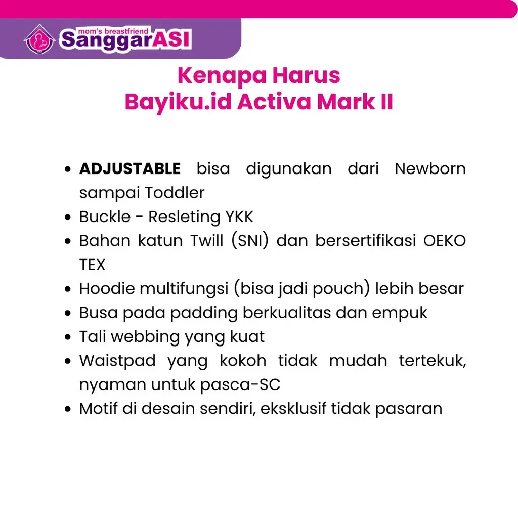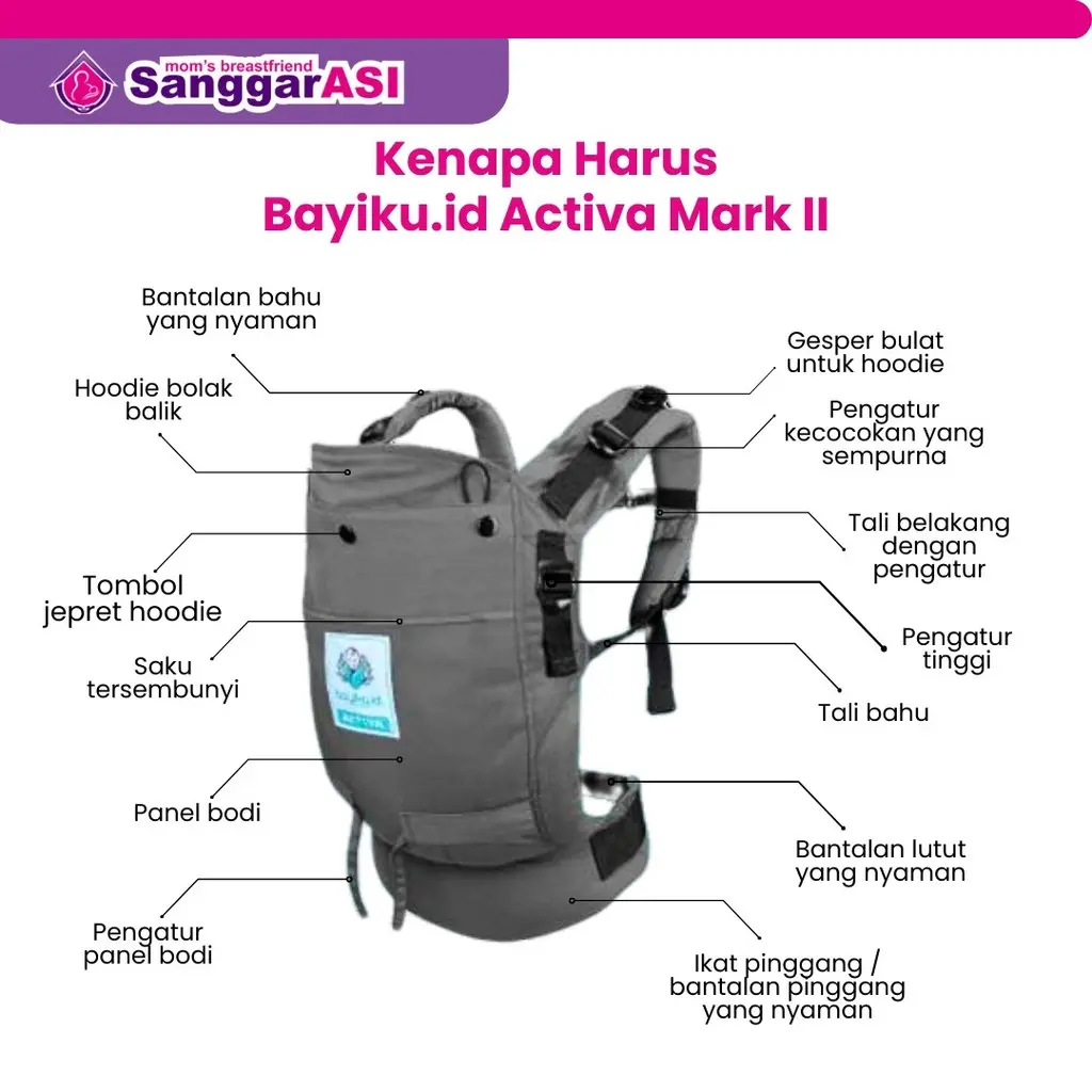 Gendongan tipe Soft Structure Carrier yang di design dengan sangat memperhatikan kebutuhan Mommies & buah hati