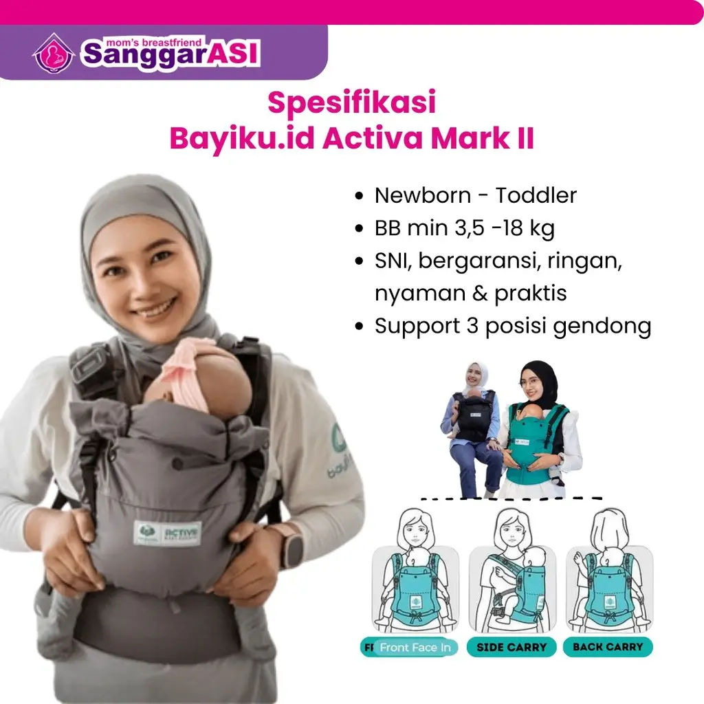 ☘ Dapat digunakan untuk menggendong depan (Front Facing In), hipcarry/samping dan back carry/belakang