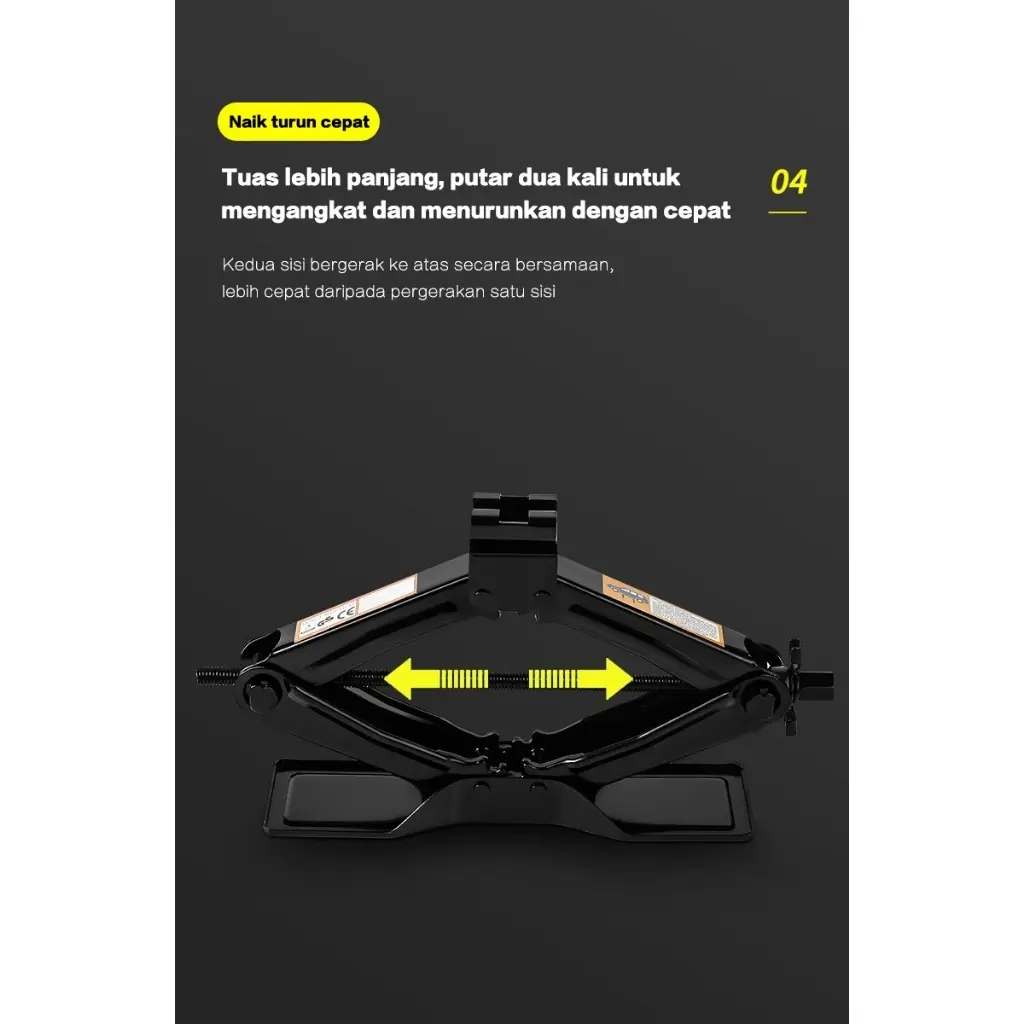 - Dongkrak gunting baja berbingkai logam tugas berat, dapat dilipat, didesain ringkas dan dapat digunakan sebagai dongkrak pengganti yang kokoh atau sebagai dongkrak utilitas tambahan yang dapat disimpan di bagasi mobil Anda.
