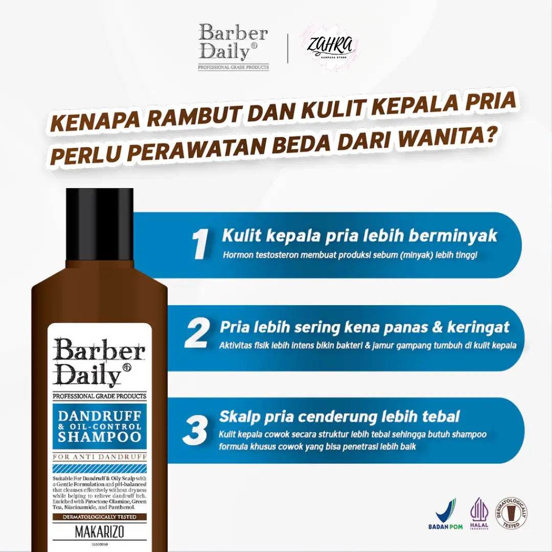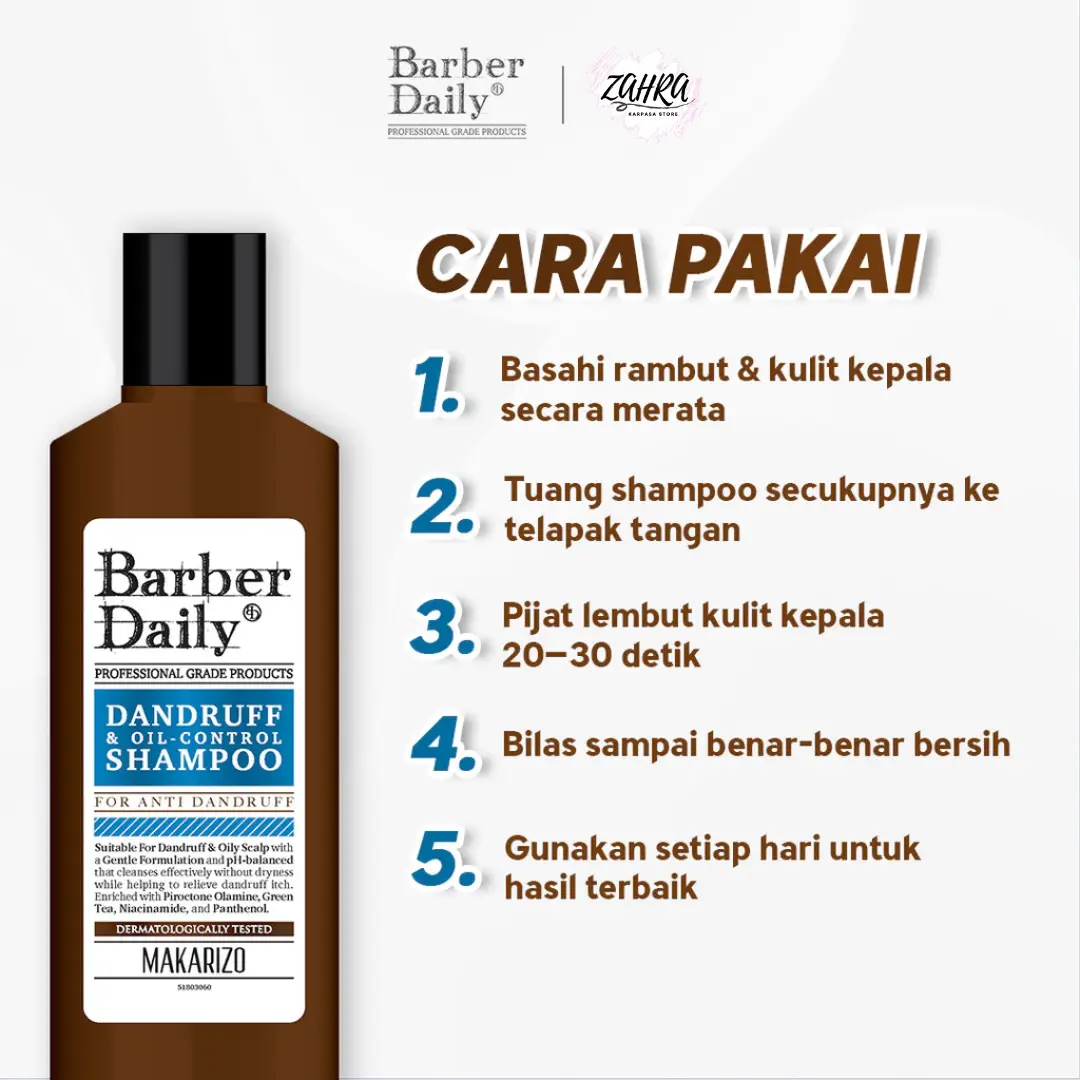 BARBER DAILY DAILY DANDRUFF & OIL-CONTROL SHAMPOO diformulasikan untuk pria dengan ketombe & kepala berminyak. Diperkaya dengan Piroctone Olamine untuk membantu mengurangi flek, Green Tea, serta Niacinamide & Panthenol untuk mengontrol minyak & meningkatkan kenyamanan kulit kepala. SLS free, dan Paraben juga Silicon free, sehingga tidak menyebabkan rambut kering. Dapat digunakan setiap hari.