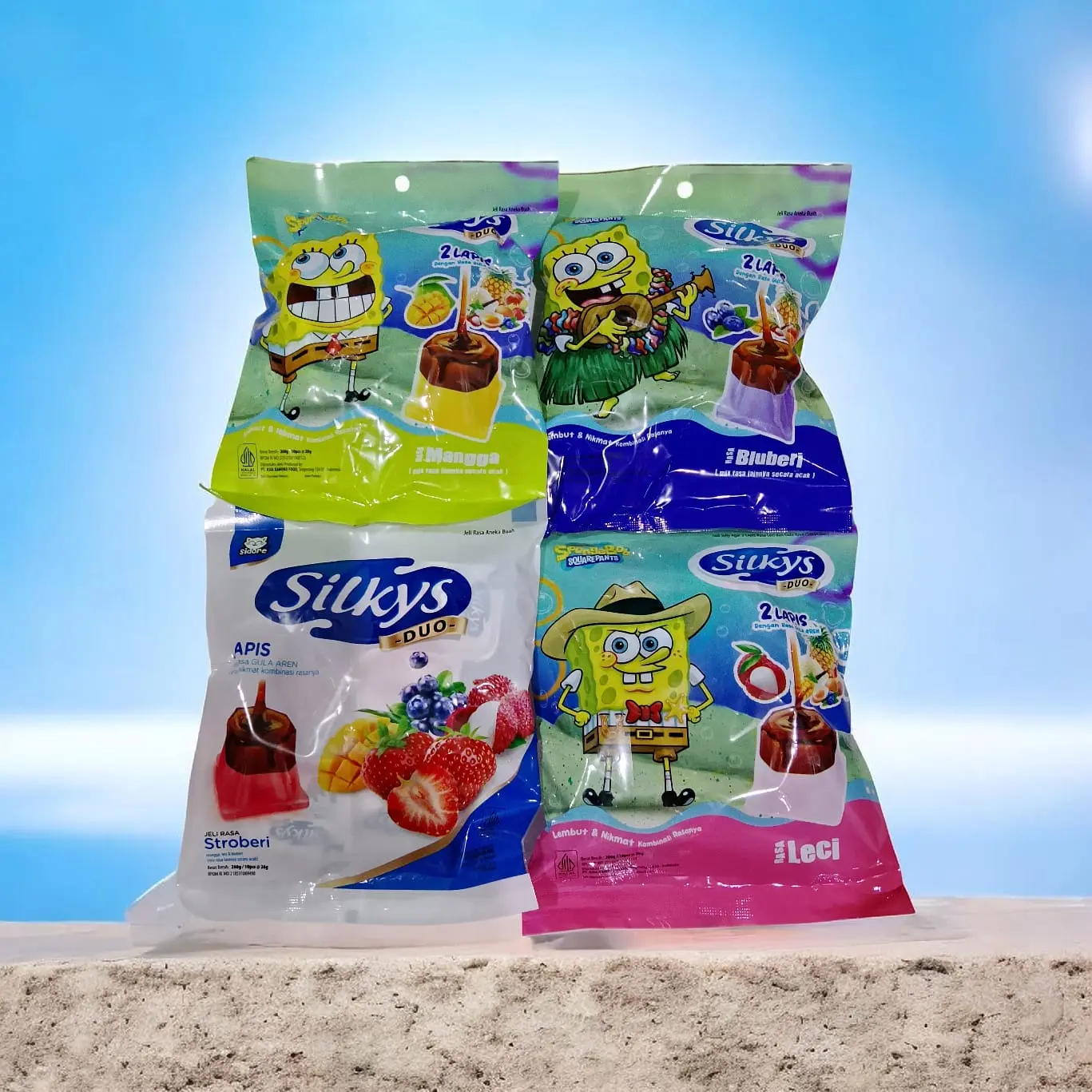 Silkys Jelly Pudding Duo Lapis Gula Aren menggabungkan lembutnya pudding dan kenyalnya jelly dalam dua lapisan. Dengan manis legit gula aren, rasa menjadi lebih kaya dan berbeda. Tersedia tiga varian: Leci, Mangga, dan Blueberi. Setiap sendokan menawarkan tekstur lembut dan kenyal.